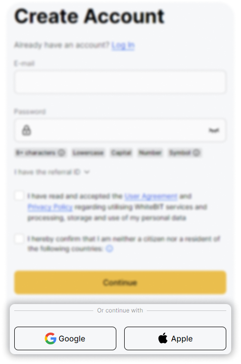 Registration is also available using your Google or Apple account. To register, click on one of the options: “Sign up with Google” or “Sign up with Apple”.