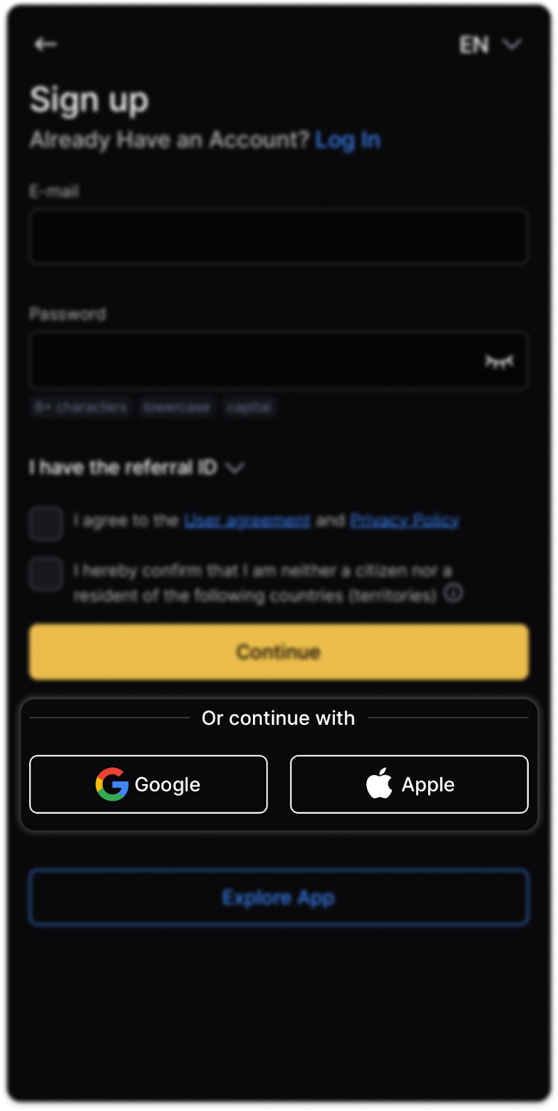You can also register in the mobile app using your Google or Apple account. To register, click on one of the options: “Sign up with Google” or “Sign up with Apple”.
