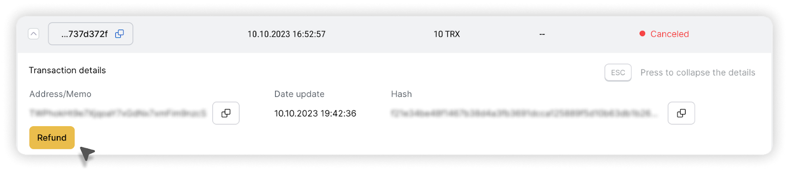 4. If a positive decision is made to refund the funds, you will see the inscription "Funds have been refunded" when you go to the transaction details in your personal account.