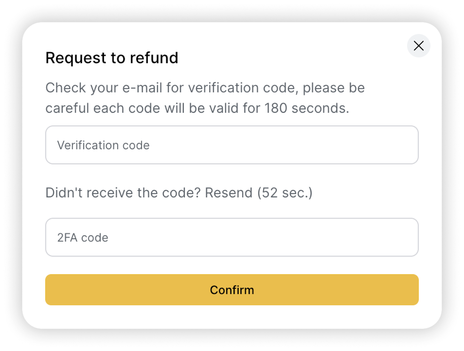 3. Confirm the creation of the “Refund” application. You will receive a code by e-mail. Enter it in the appropriate field in the confirmation window. You will also need to enter the 2FA code (if the function is enabled on your account).