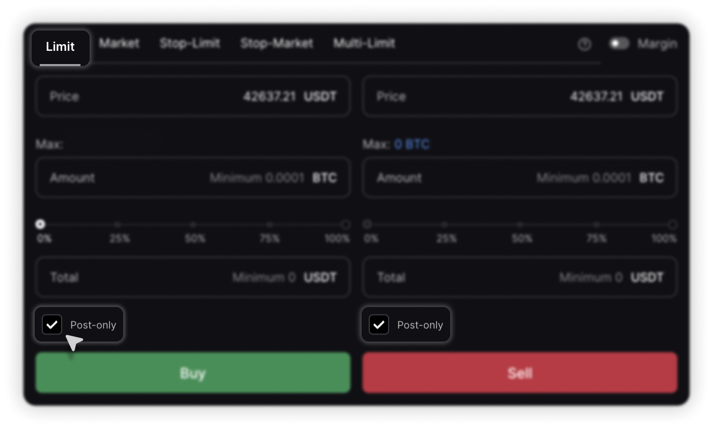 These options are available only for limit orders. You can also find the Post-only switch in the Multi-Limit order interface, which is a type of the same limit order.