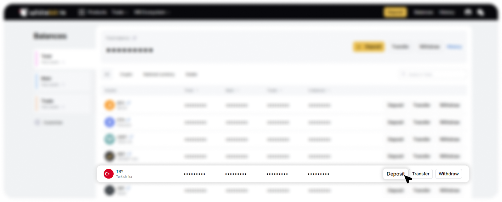 - Press “Deposit” in the line opposite the Turkish lira currency ticker (TRY) .