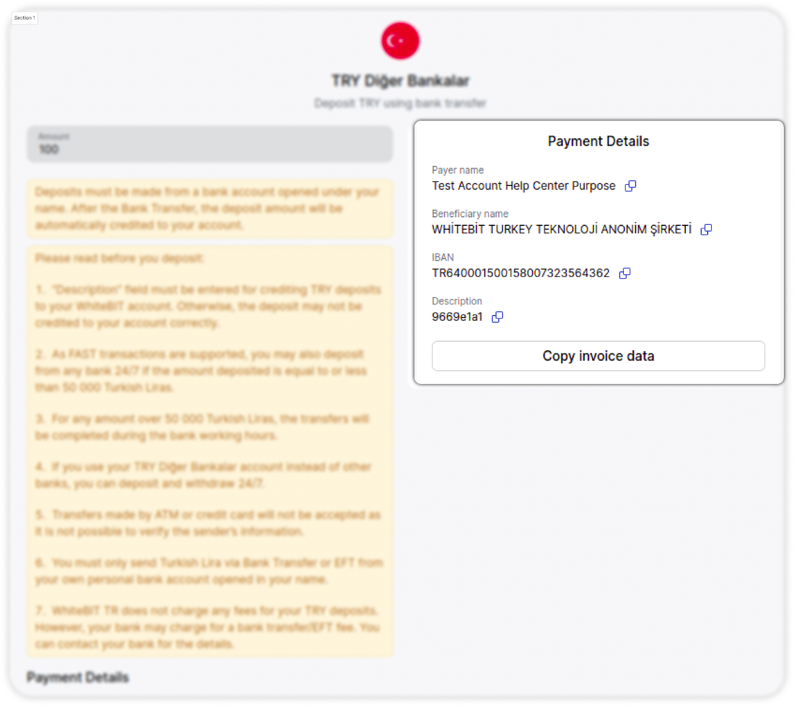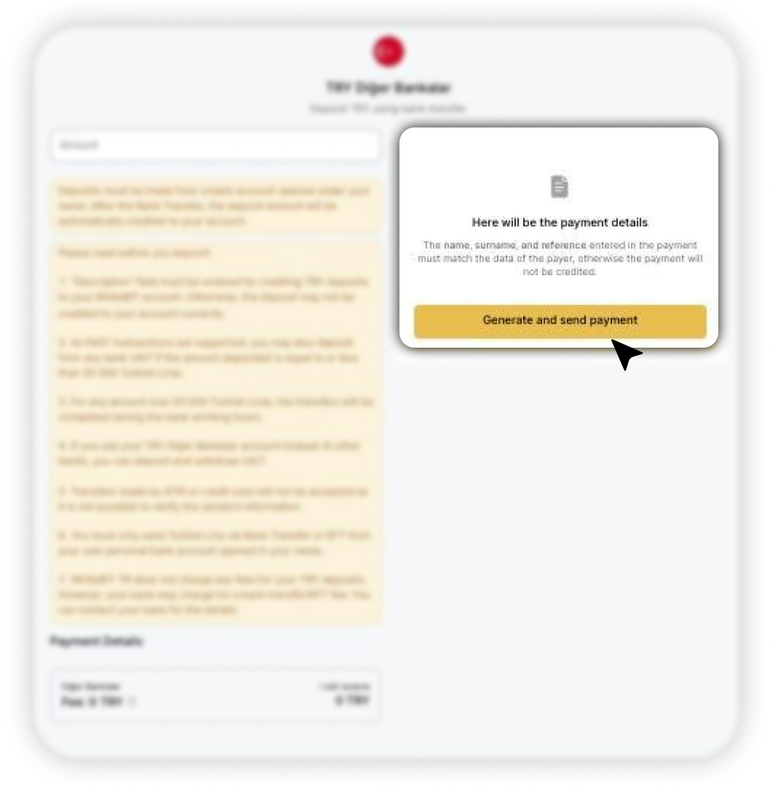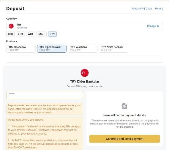 Currently, users of WhiteBIT TR have the opportunity to make Turkish Lira (TRY) deposits using Diğer Bankalar payment system.