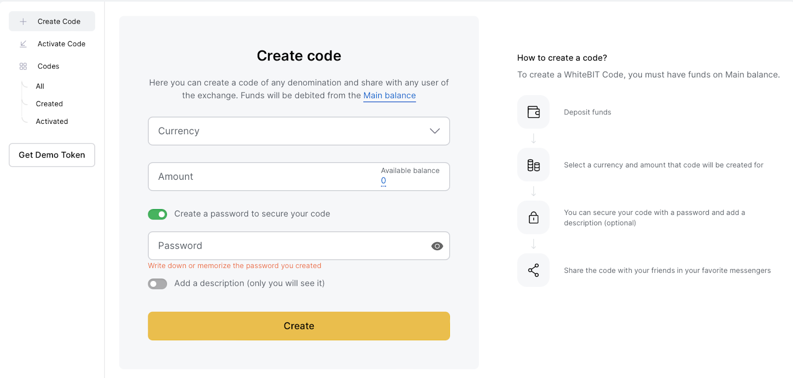 4. You can create a password for your WhiteBIT Code and add a Description only you will be able to see. If you don’t want to add anything, simply click “Create”;