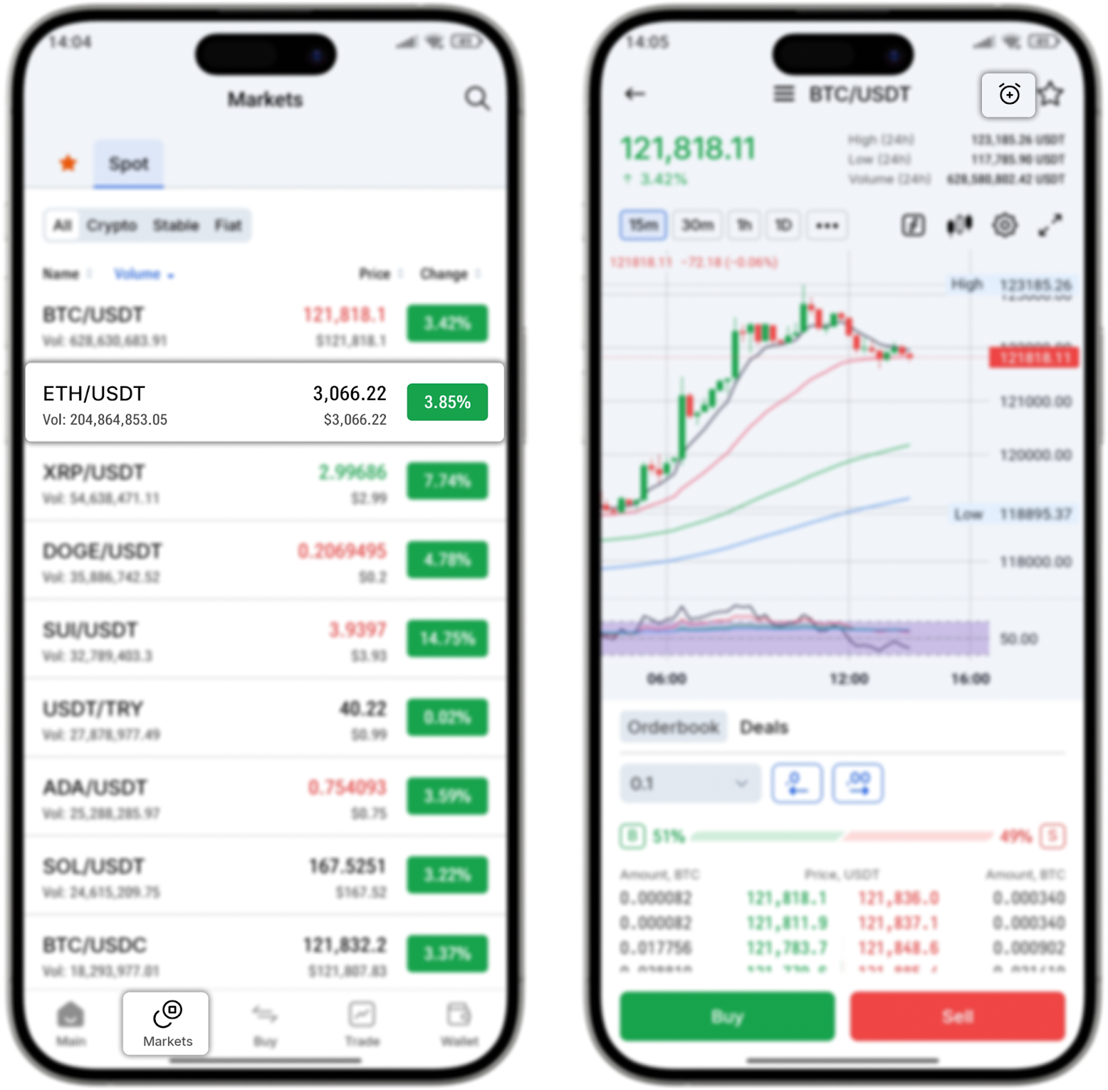 Select a trading pair in the “Markets” section. In the trading terminal of the selected pair, you will see an alarm icon in the upper corner to the right of the trading pair — this is the “Alerts” section.