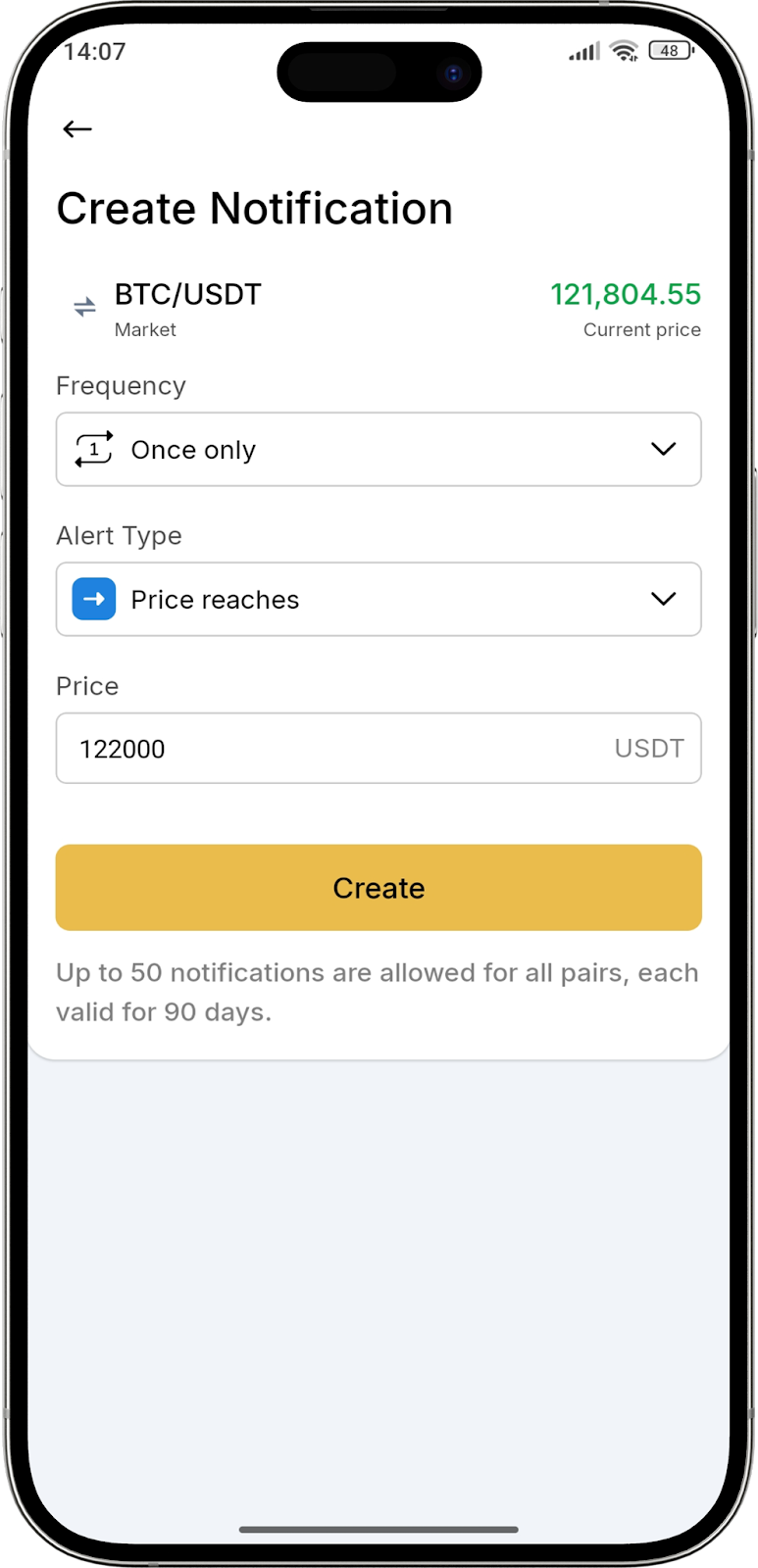 Price alerts help you track changes in digital asset prices in the market. You can set up notifications when the price reaches a certain value, as well as the frequency of these notifications.