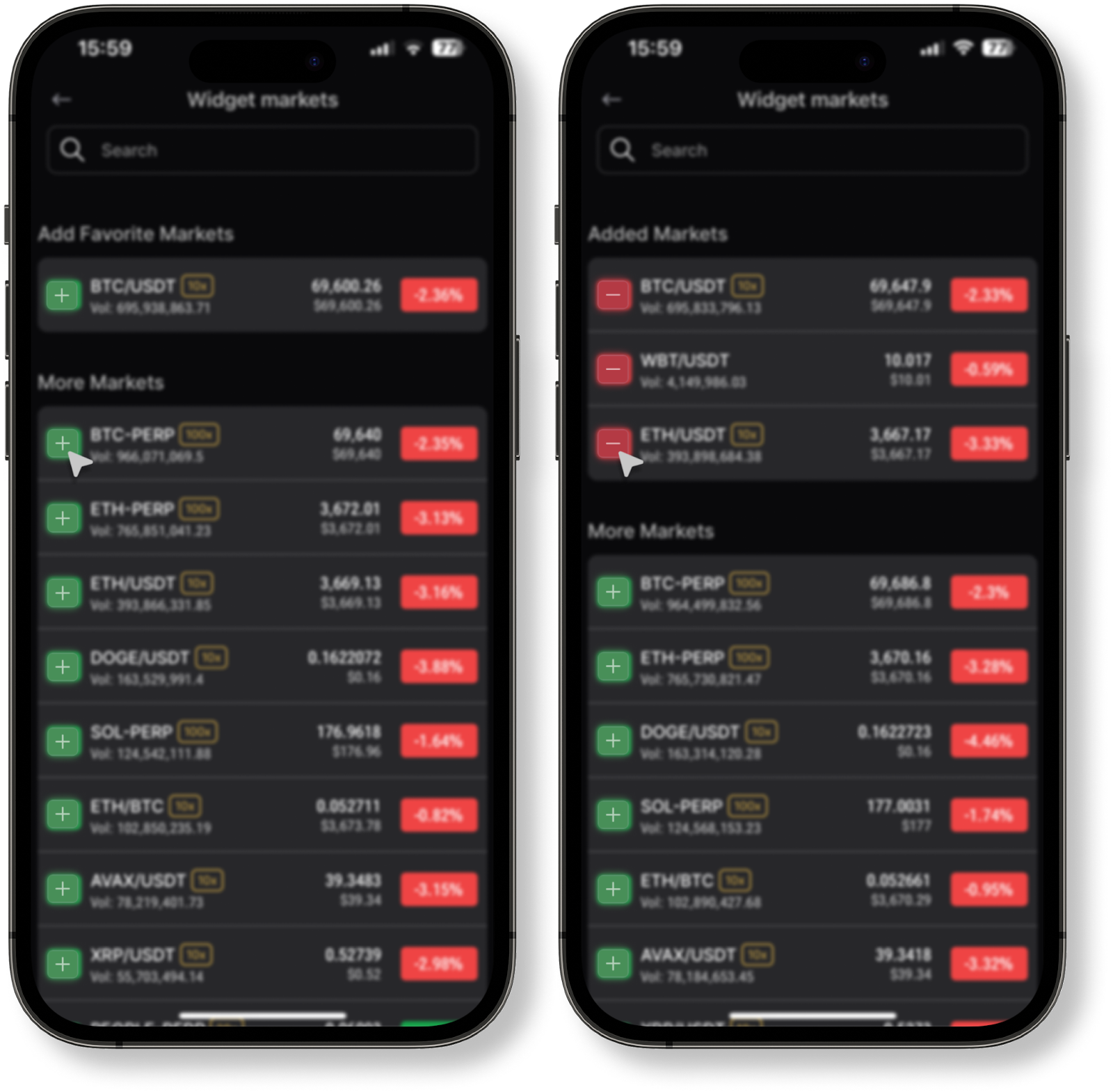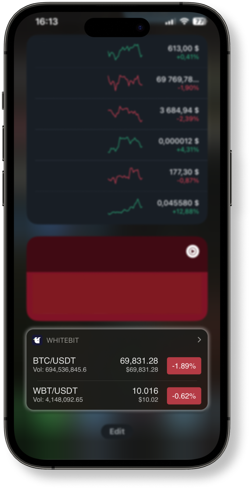 Please note: You can add/remove trading pairs by clicking on the “Edit” button located on the widget itself. After pressing it, the widget markets selection tab will open in the WhiteBIT TR mobile app. The changes made will be automatically added to the widget on the main screen of your mobile device.