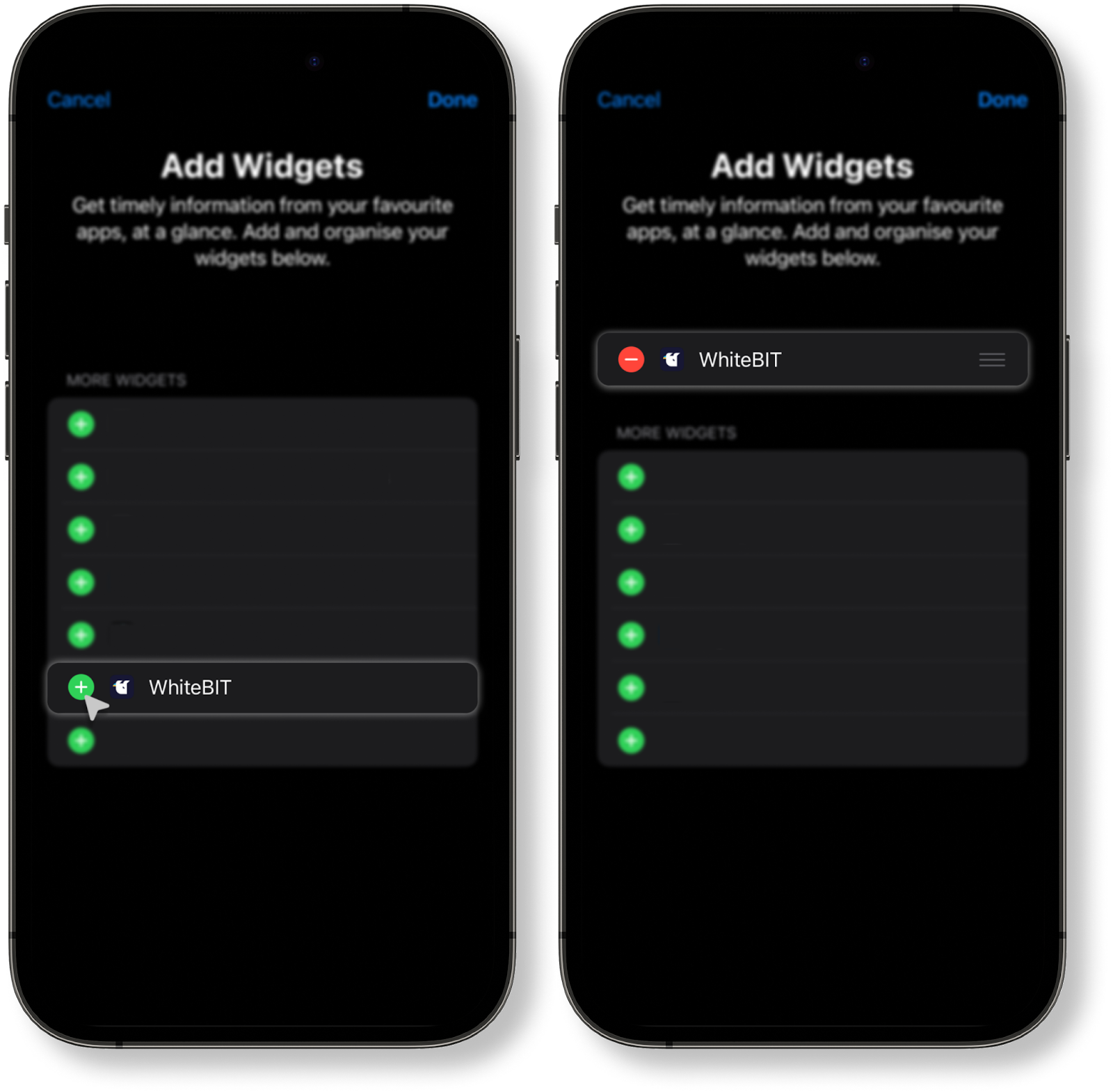 - In the “More Widgets” list, select “WhiteBIT” and click on the “+” symbol in the corresponding line. Press “Done”.