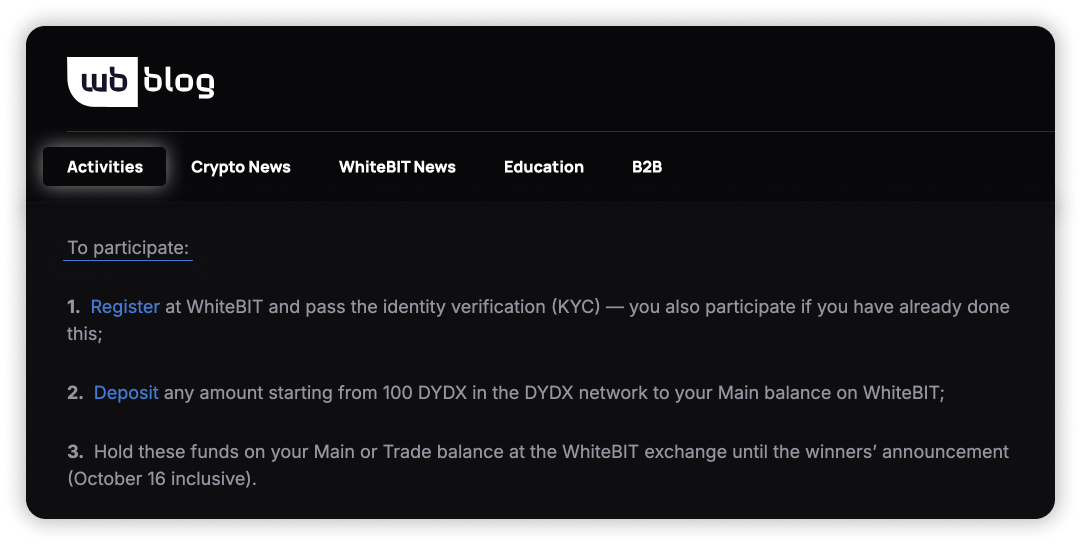 You can discover all current and upcoming activities by following the WhiteBIT Blog Activities Page.