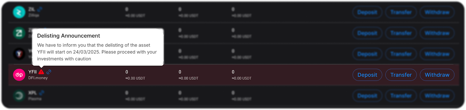 Please note: the penalty is applied in the currency of the delisted asset. Users’ other assets remain unaffected by this process.