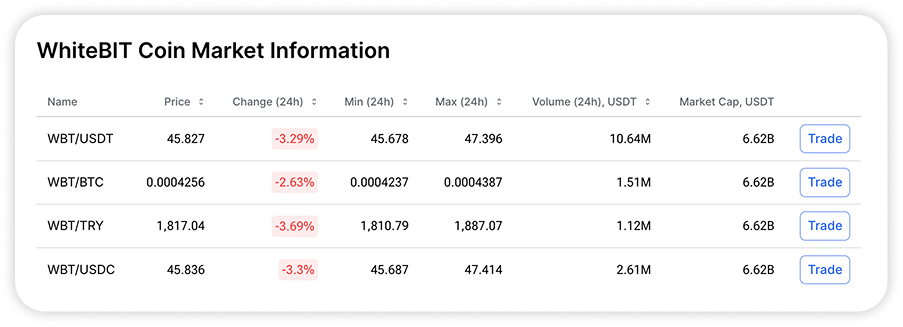 WhiteBIT TR provides a wide range of tools for effective navigation in the dynamic world of cryptocurrencies. With real-time data, lists of crypto assets, market capitalisation, charts, trading volumes and other useful metrics, our platform is useful for both experienced traders and beginners who are just starting to get acquainted with digital assets.
