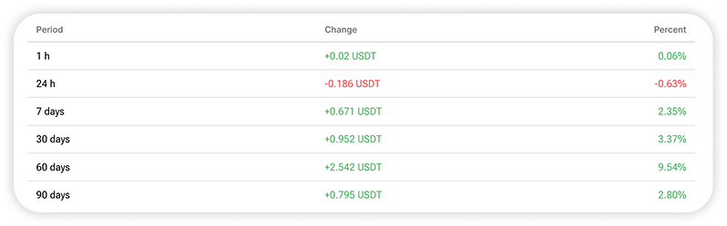 - Price change in percentage and USDT equivalent for different time periods: 1 hour, 24 hours, 7 days, 30 days, 60 days, 90 days.
