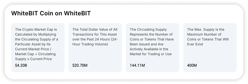 - Calculation of the cryptocurrency capitalisation, 24-hour trading volume of this asset in USD equivalent, the number of tokens in circulation, and the maximum supply (the maximum number of coins or tokens that will ever exist).
