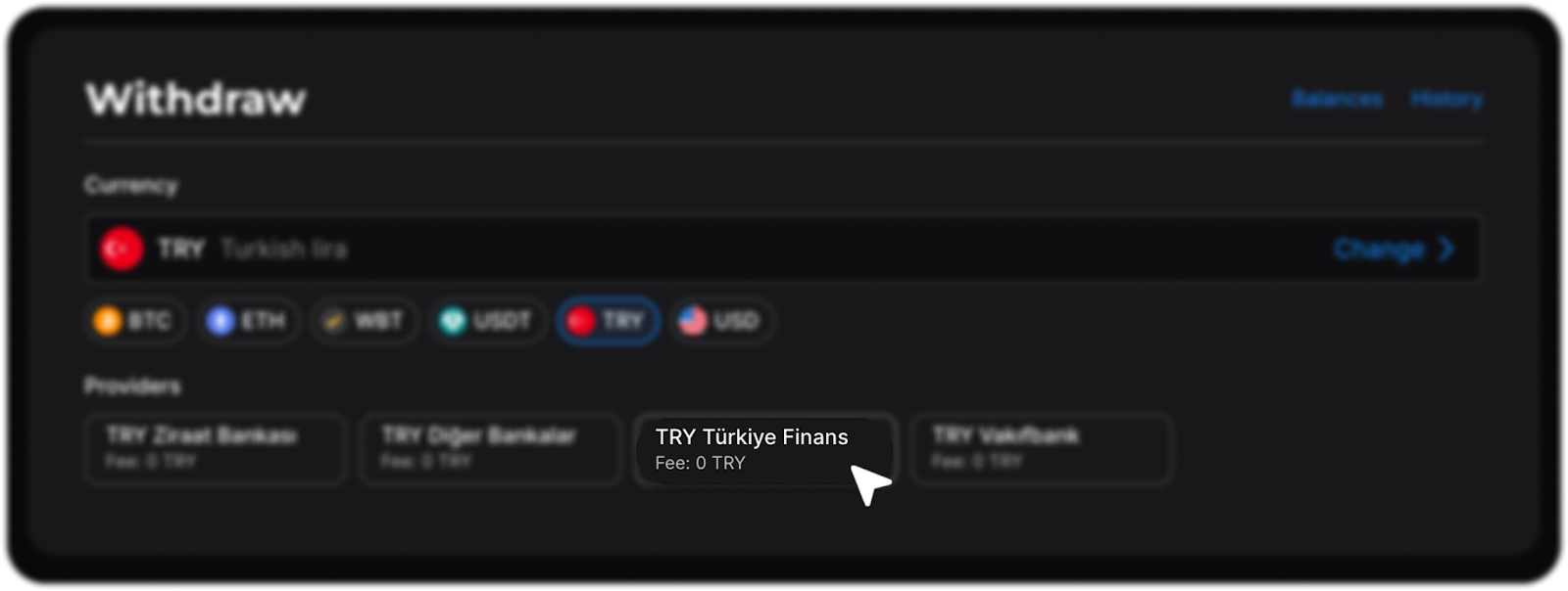 - Choose the “Turkiye Finans” provider in the withdrawal form.