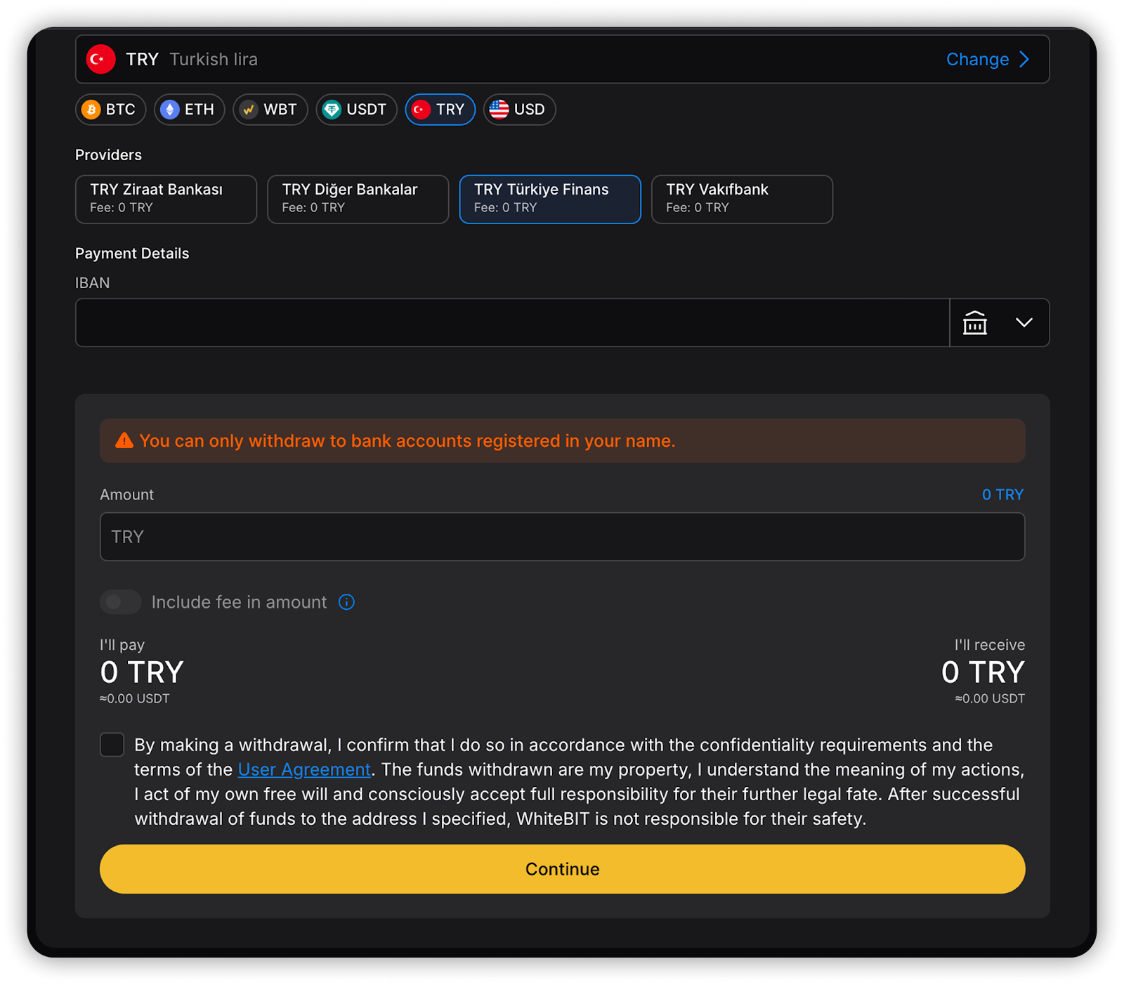 - Specify your IBAN (international bank account number) and the withdrawal amount (the available TRY amount on your balance will be displayed above). Activate the “Include fee in amount” slider and agree to the User Agreement. Make sure that all the data is correct and click on the “Continue” yellow button.