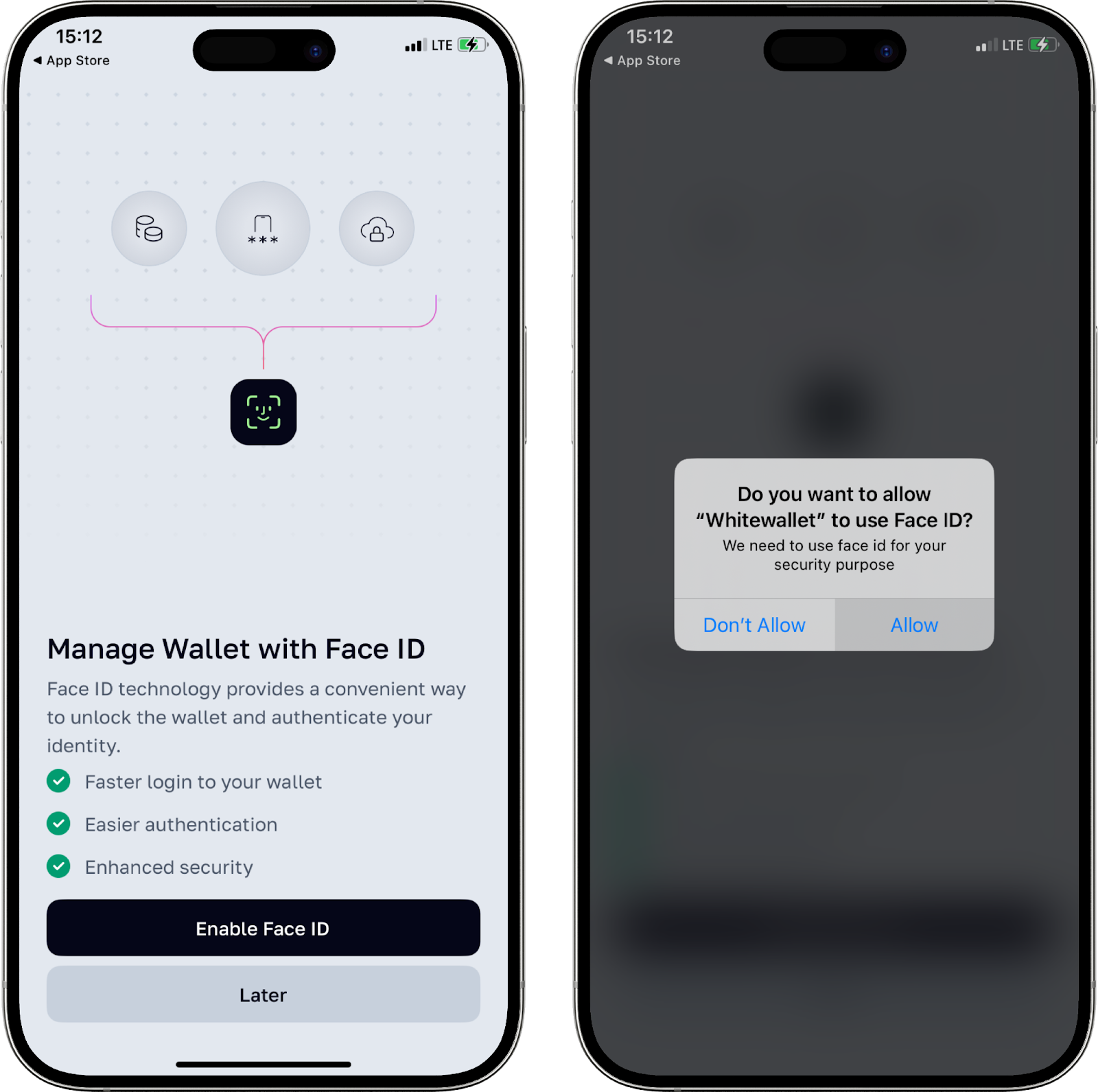 - Come up with a 4-digit PIN code and confirm it by re-entering the code in the Telegram version or add Face ID authentication in the Whitewallet mobile app.