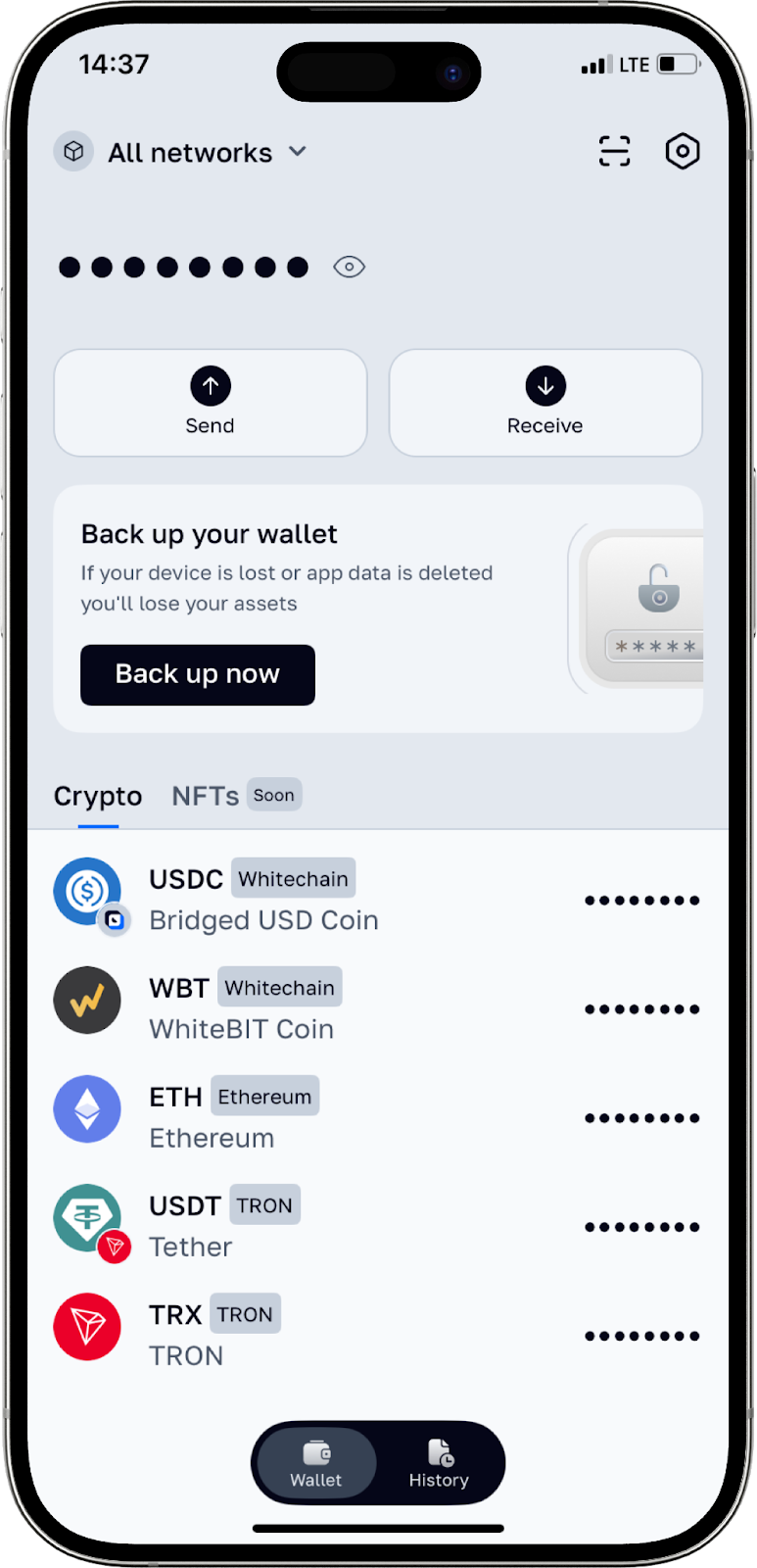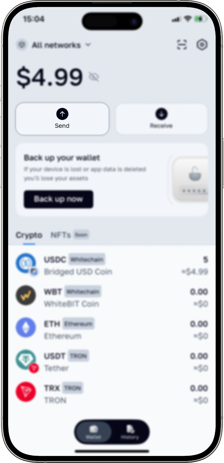 Please note: You can track the status of transactions in the “History” section on the main screen of the app. The app also offers WBT and USDC withdrawals in the Whitechain network, ETH in the Ethereum network, USDT and TRX in the TRON network and TON in its own network.