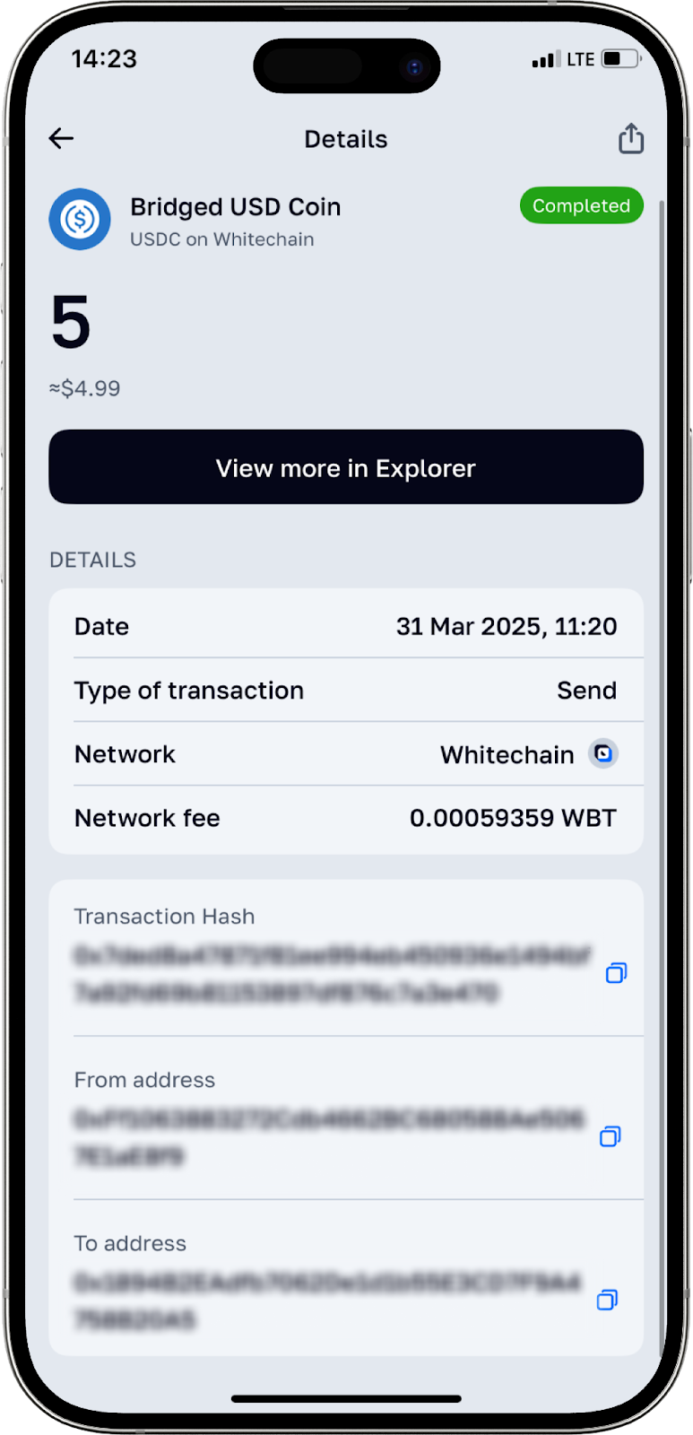 By clicking on the hash or one of the addresses, you will automatically be redirected to the explorer page (http://explorer.whitechain.io/).