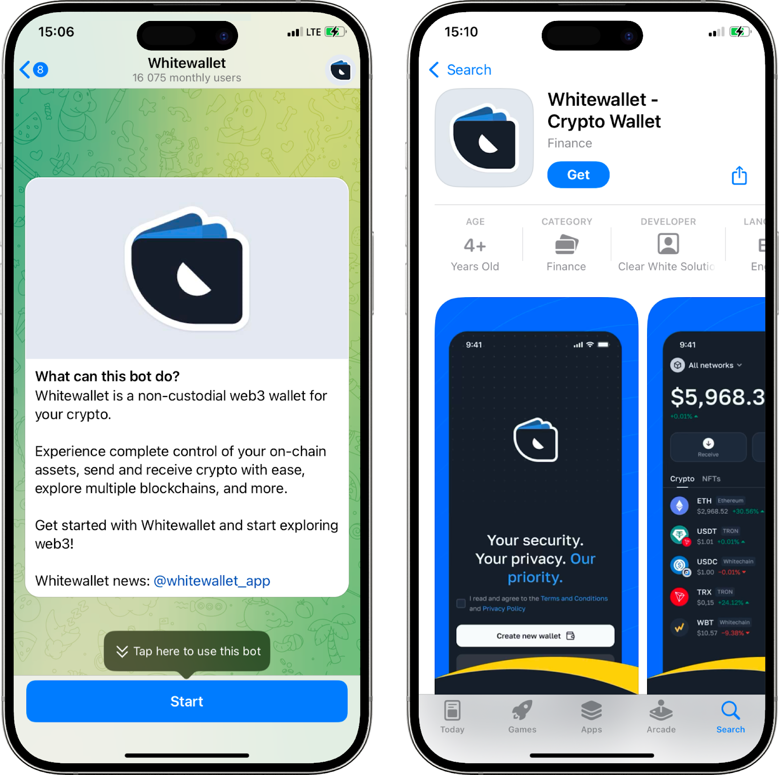 Whitewallet is a wallet app inside the Telegram bot and is available for download on Google Play and the App Store. This wallet allows you to easily manage your funds, make instant deposits and withdrawals, receive and send NFT, without leaving the messenger.