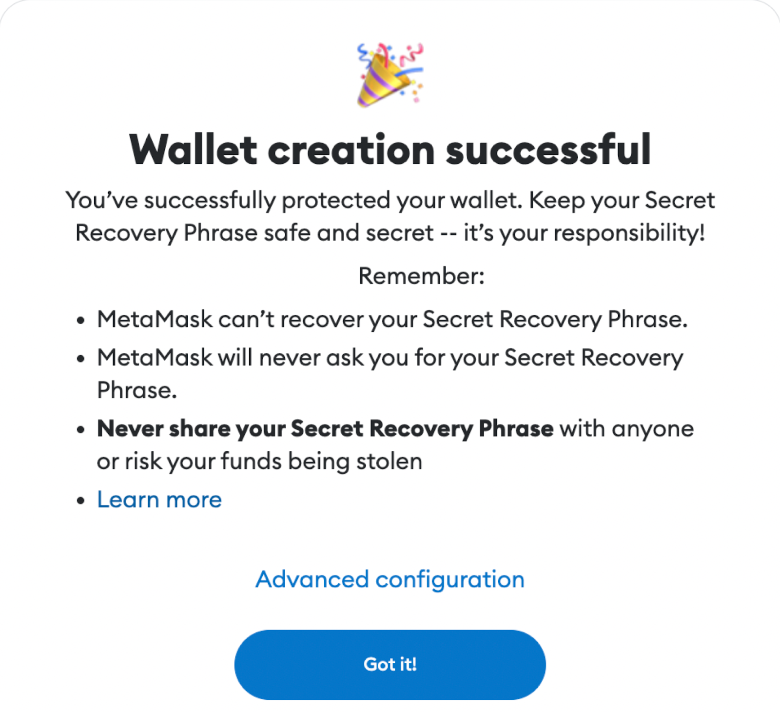 4. MetaMask, ek hesap koruması için ek bir seçenek olan Gizli Kurtarma İfadesi'ni önerir. Bu korumayı kullanmak daha iyidir. Hemen veya daha sonra yapılabilir.