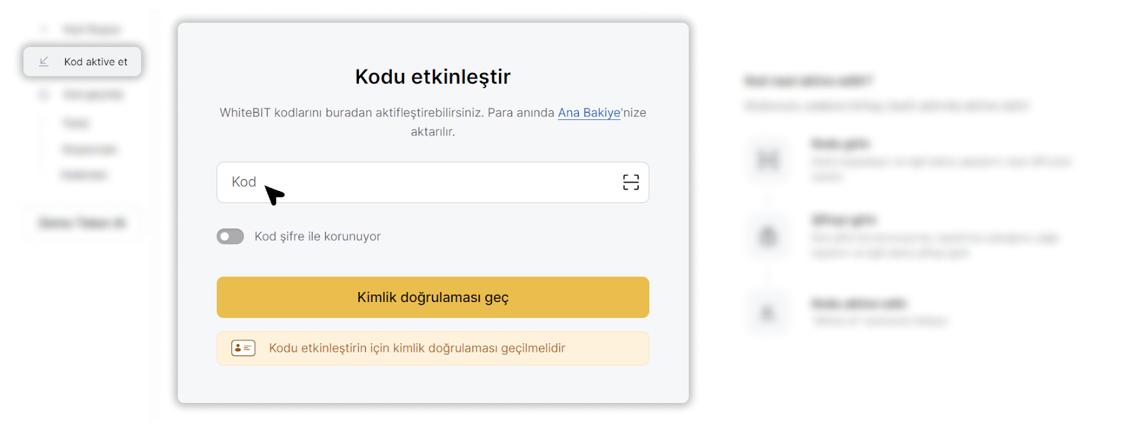 - Sistemden alınan kodlar hesabınızla ilişkilendirilir. Bu nedenle hesabınıza ait Demo Token kodlarını başka bir kullanıcı ile paylaştığınızda onun hesabında çalışmayacaklardır. Ancak, kodu kendi hesabınızda etkinleştirdikten sonra, yeni bir WhiteBIT koduna dönüştürebilir ve başka bir kullanıcıyla paylaştığınızda onu kullanabileceklerdir!