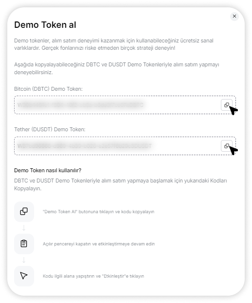 - DBTC ve DUSDT (sırasıyla sanal Bitcoin ve Tether) Demo Token kodlarını ve nasıl aktive edileceklerini gösteren ekran açılacaktır. Kodlardan birini kopyalayın ve bu pencereyi kapatın.