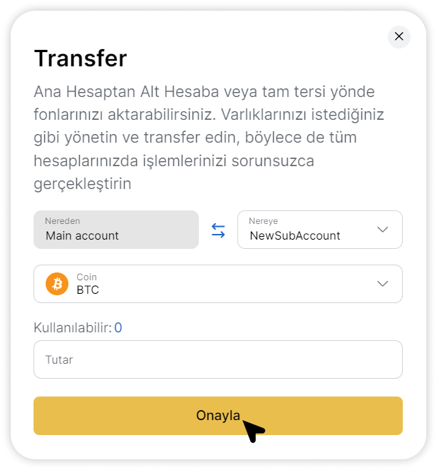 Ana Hesabınızdan Alt Hesaba para aktarmak için, ayarlardaki Alt Hesap bölümüne gitmeniz ve para aktarmak istediğiniz Alt Hesabın yanındaki “Transfer” butonunu seçmeniz gerekir.