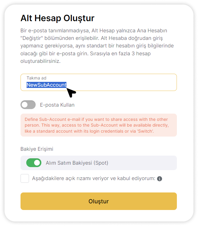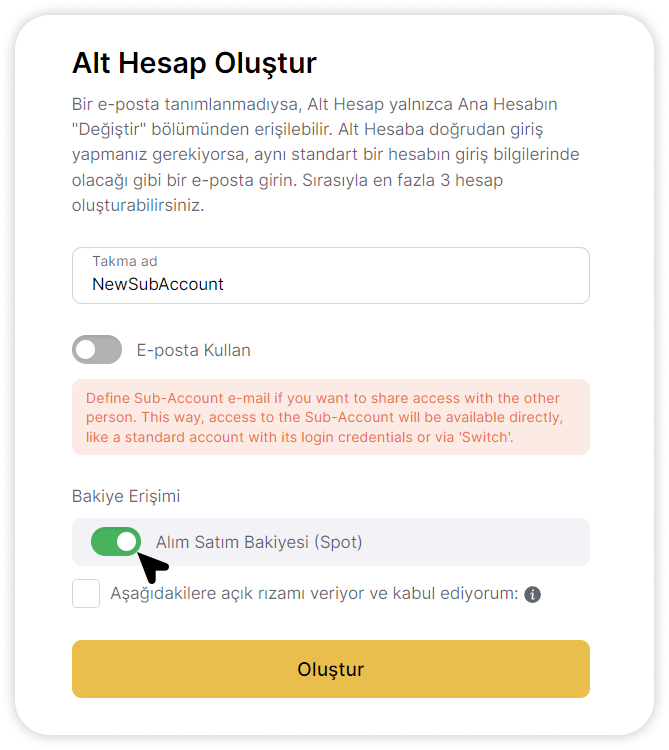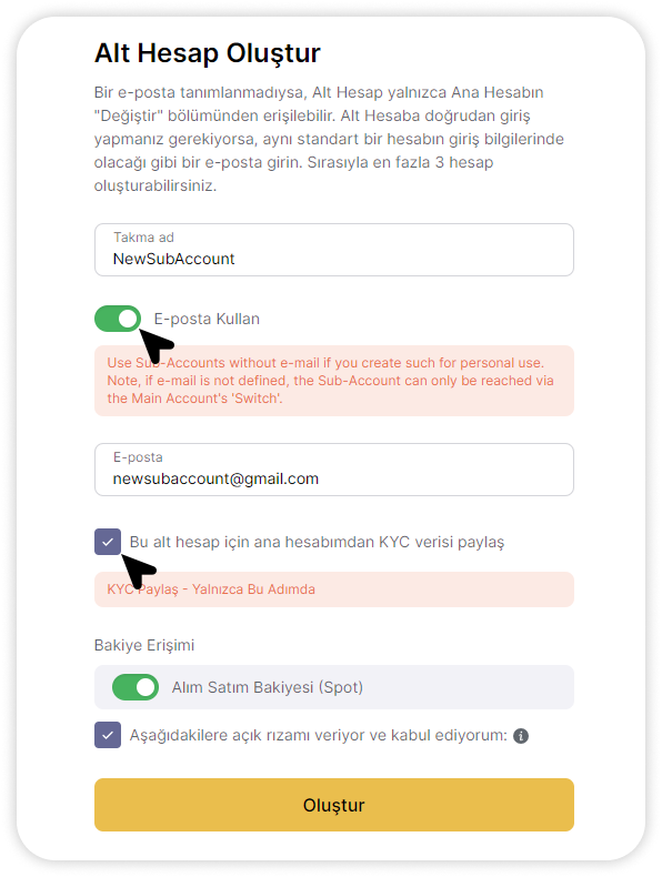 - Kişisel kullanım için Alt Hesap oluşturursanız, “E-posta Kullan” seçeneğini etkinleştirmeniz gerekmez. Bu durumda, KYC bilgileri otomatik olarak alt hesaba aktarılacaktır. Yeni e-posta adresi kullanıyorsanız, kimlik doğrulama sertifikasını Alt Hesap ile paylaşmak için “KYC verisi paylaş” seçeneğini onaylamalısınız. Bu seçenek sadece bu aşamada kullanılabilir. KYC kayıt sırasında paylaşılmazsa, Alt Hesap kullanıcısı bunu kendi başına tamamlamalıdır.