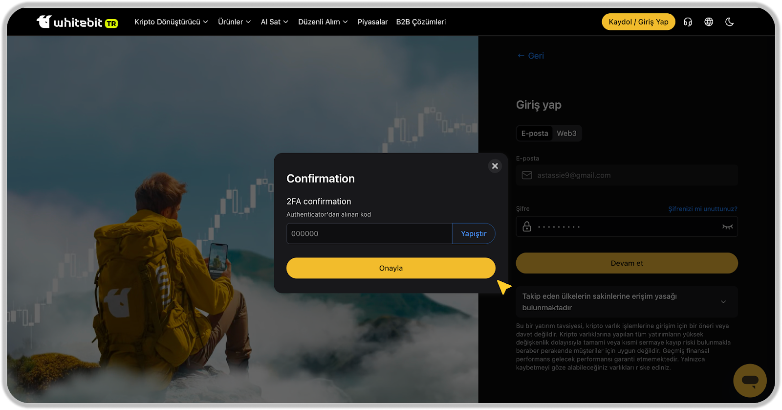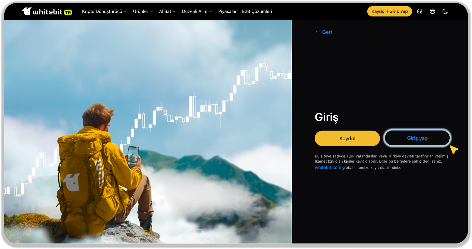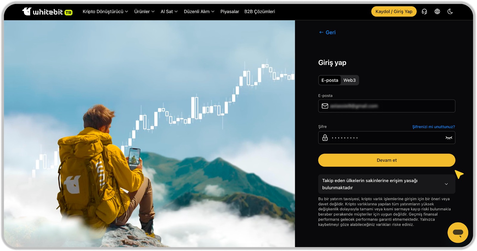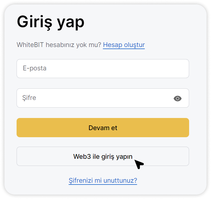 - Ardından, "Giriş Yap" seçeneğine tıklayın ve hesabınıza giriş yapmanız için bir form açılacaktır. https://whitebit-tr.com/ sitesinde olduğunuzdan emin olun.