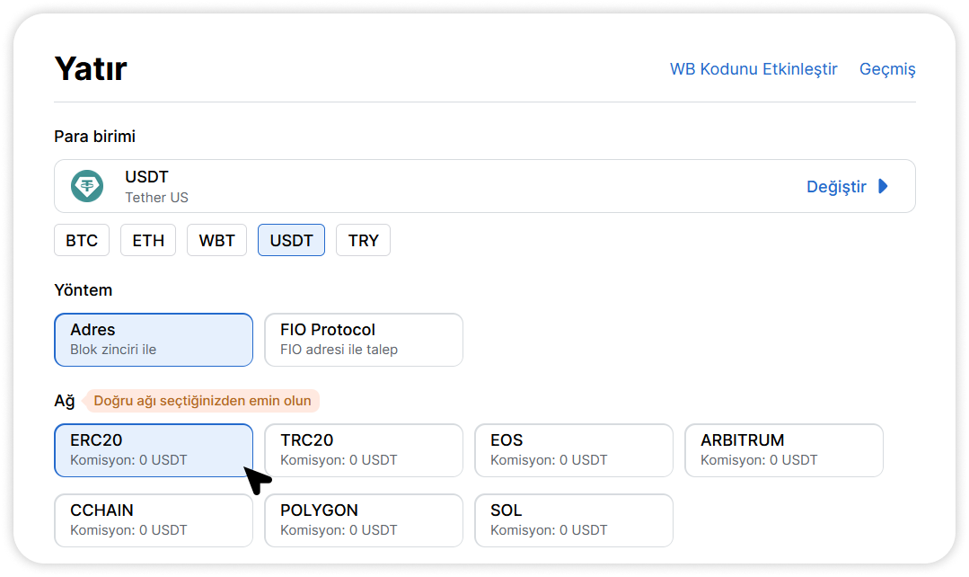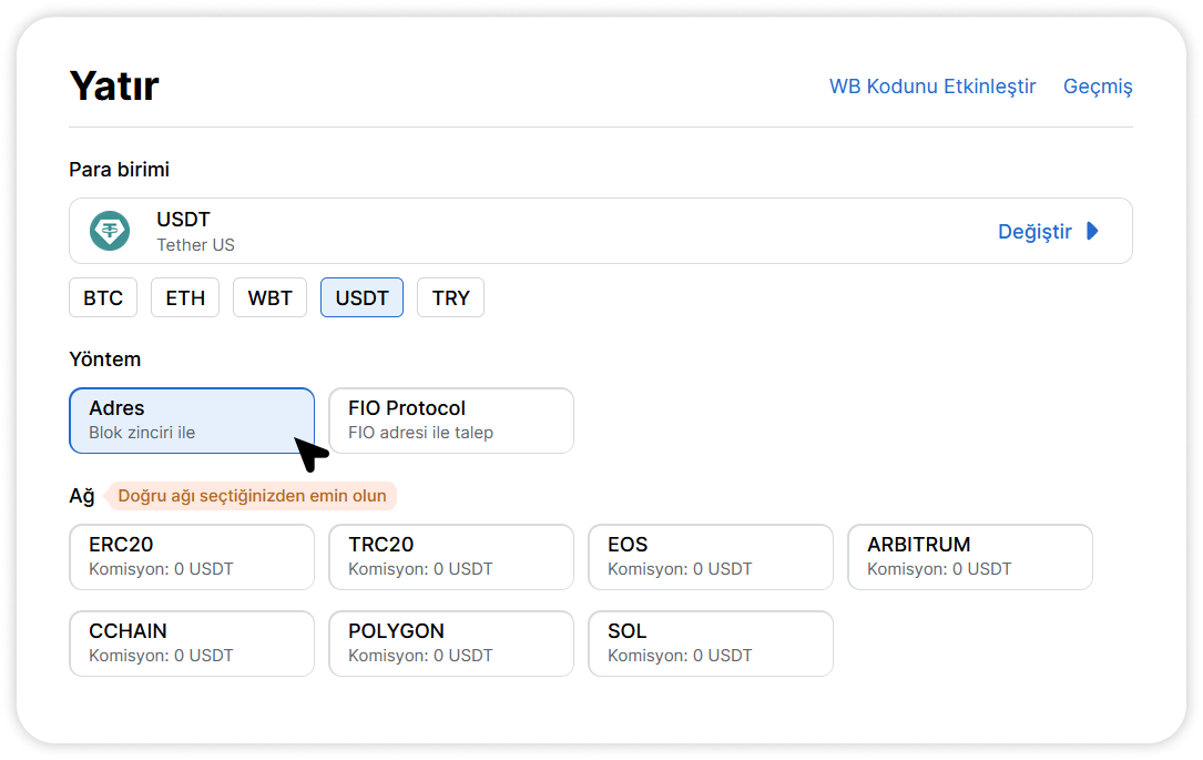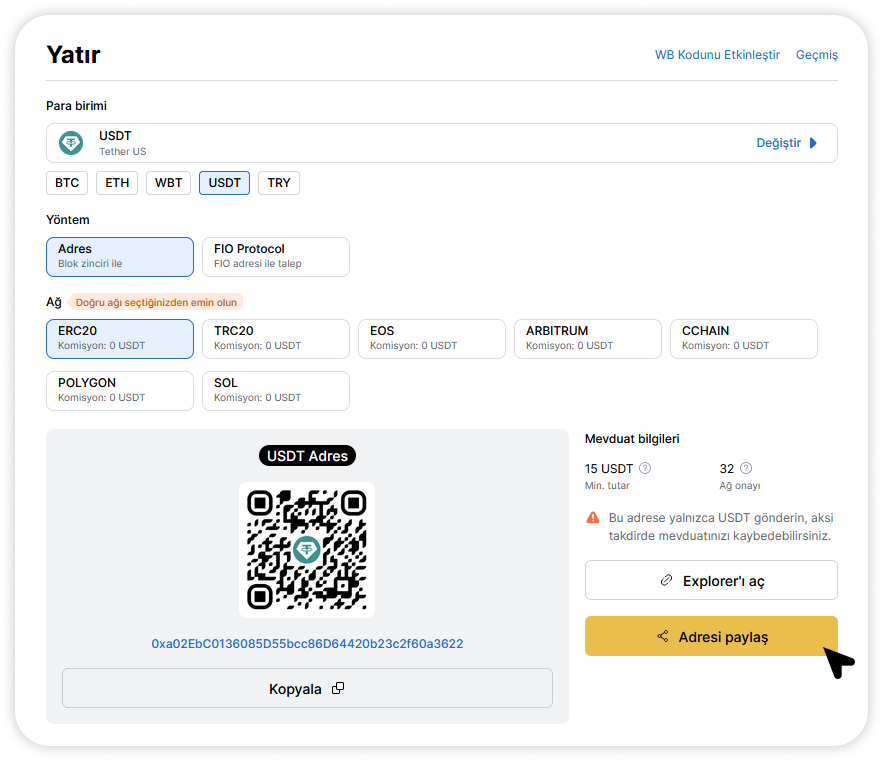 Önemli: Para yatırma için kullandığınız ağı (token standardı) WhiteBIT TR borsasındaki ağ (token standardı) ile aynı olmalıdır.