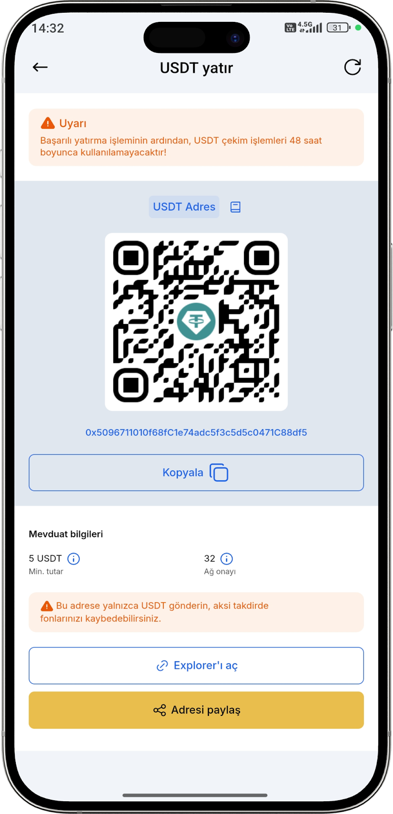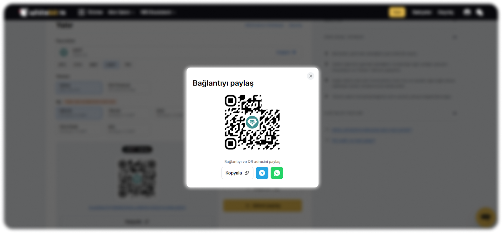 Önemli: Para yatırma işlemleri için kullanacağınız gönderici ağı (token standardı) WhiteBIT TR borsasındaki ağ (token standardı) ile aynı olmalıdır.