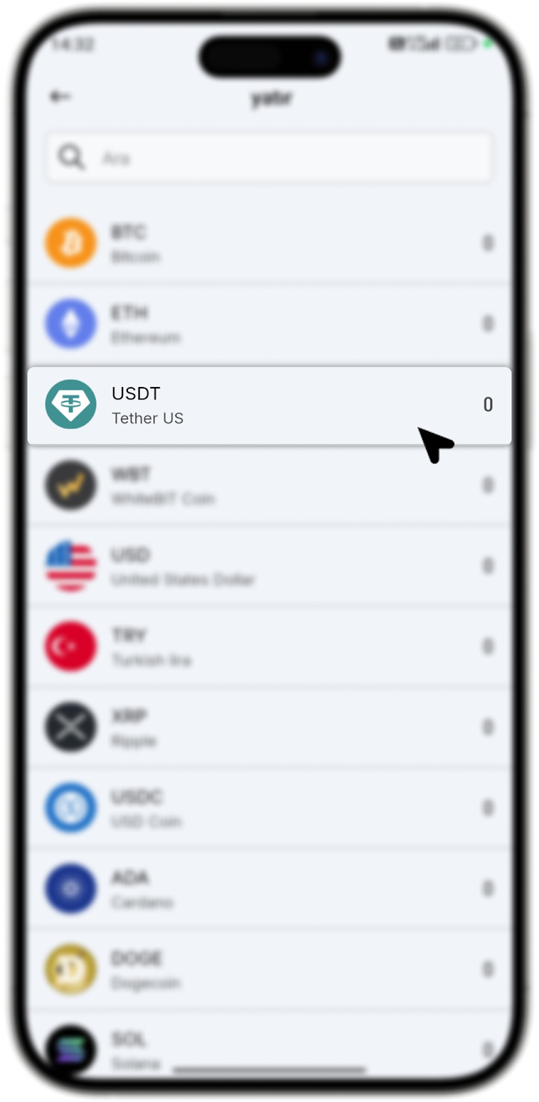 - Bu düğmeye tıkladığınızda, para yatırmak için mevcut para birimlerinin bir listesini göreceksiniz. İhtiyacınız olan varlığı hızlı bir şekilde bulmak için arama işlevini kullanabilirsiniz (örneğin, USDT).