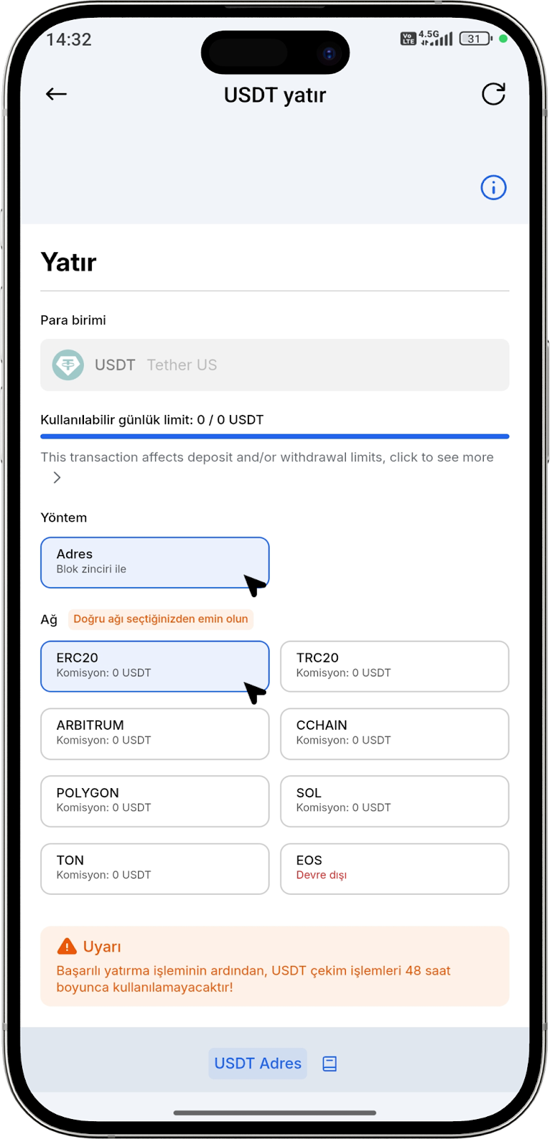 Bu makalede, “Adres” yöntemini kullanarak kripto para yatırma sürecine daha yakından bakacağız. Hadi USDT yatırmayı deneyelim!