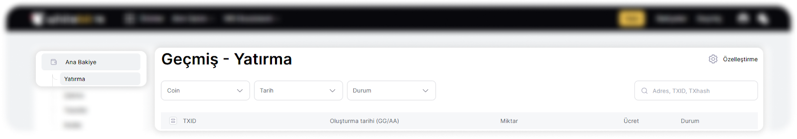 Para yatırma işleminizin bilgilerı (miktar, oluşturma tarihi, ücret, explorerdeki işlem bağlantısı) ve durumu, web sayfasının sağ üst köşesinde bulunan “Geçmiş” – “Yatırma” sekmesinde görüntülenecektir.