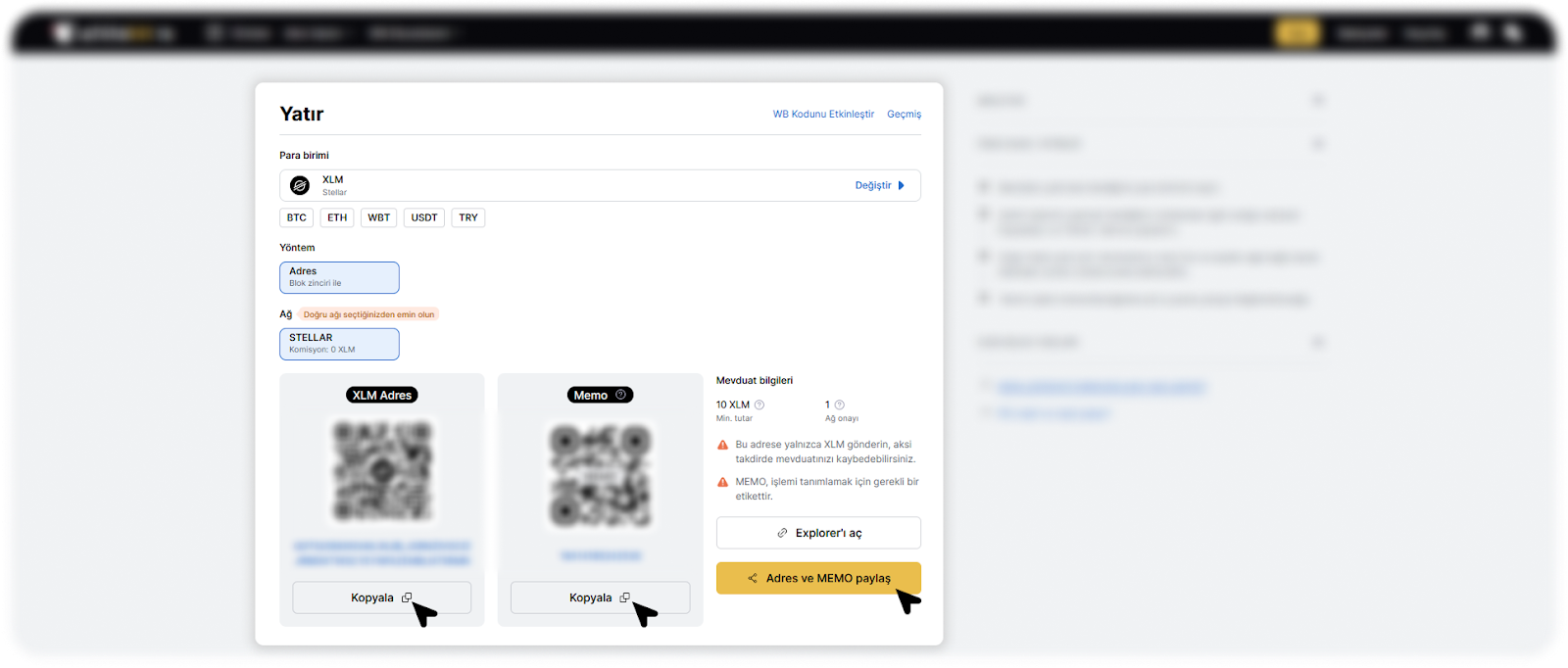Önemli: Adresi ve memo gönderenin platformundaki ilgili alanlara yapıştırmak için “Kopyala” düğmesini kullanabilirsiniz. Alternatif olarak, sarı renkli “Adres ve MEMO paylaş” düğmesine tıklayabilirsiniz ve bilgilerinizi mevcut mesajlaşma platformlarından biriyle para göndericisine gönderebilirsiniz.