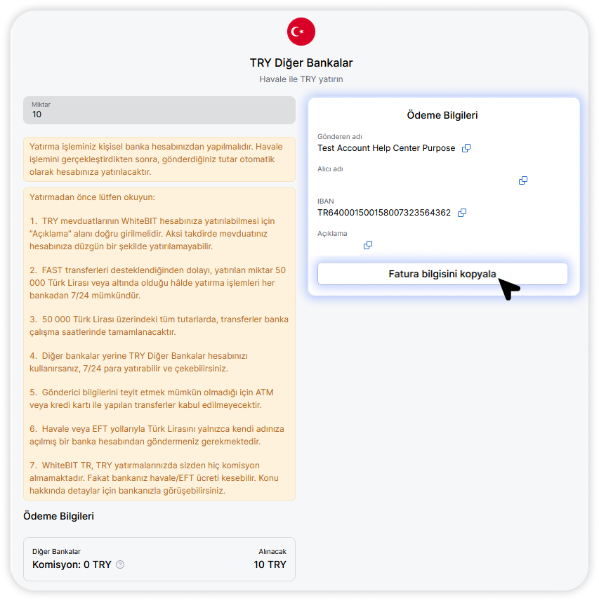 - Ödemenin nasıl yapılacağına ilişkin talimatları içeren TRY yatırma formu aşağıda yer alacaktır. WhiteBIT TR hesabınıza yatırmak istediğiniz TRY miktarını belirtin. Diğer Bankalar'dan para yatırmak için WhiteBIT TR tarafından sağlanan özel talimatlara ve ayrıntılara dikkat edin.