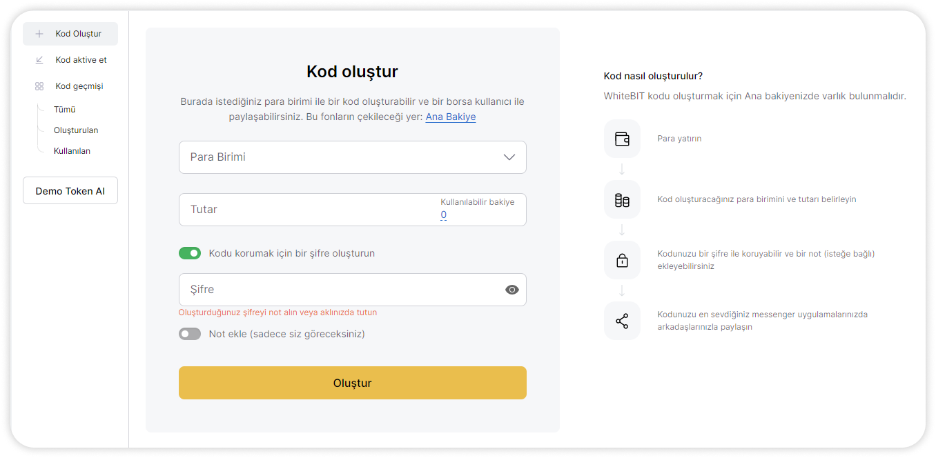 5. WhiteBIT Global'deki WhiteBIT Kodları sayfasına devam edin ve oluşturduğunuz kodu girin;