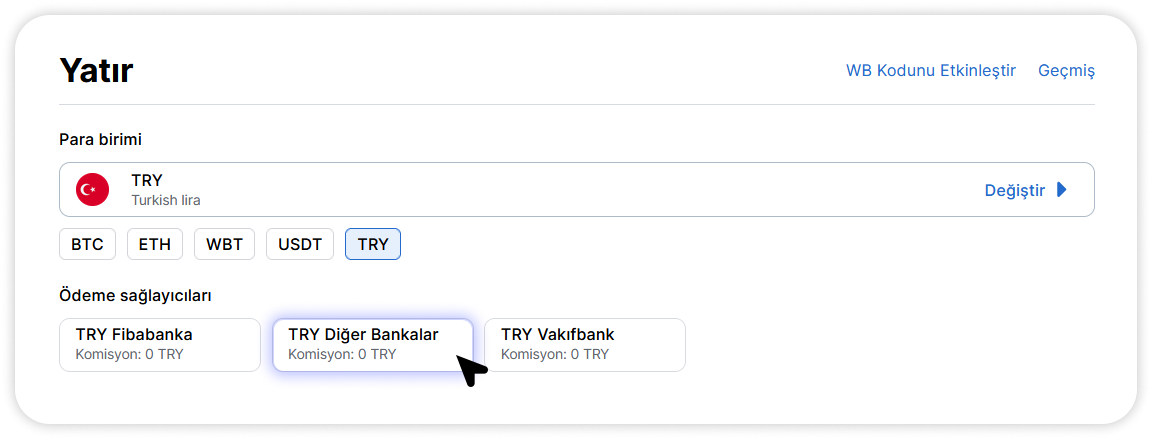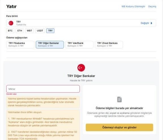 Diğer Bankalar ödeme sağlayıcı kullanarak WhiteBIT TR'ye TRY nasıl yatırılır?
