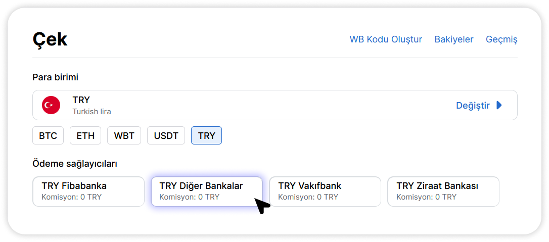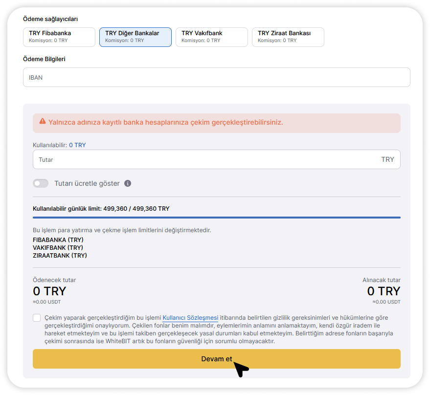 Diğer Bankalar ödeme sistemini kullanarak TRY çekmek için lütfen adım adım kılavuzu izleyin:
