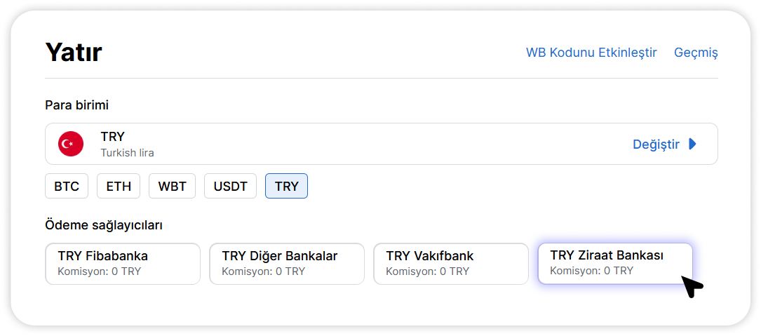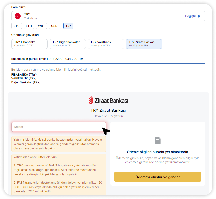 Ziraat Bankası Türkiye'nin en büyük bankalarından biridir. Şu anda, WhiteBIT TR kullanıcıları Ziraat Bankası ödeme sistemini kullanarak TRY yatırma fırsatına sahiptir.