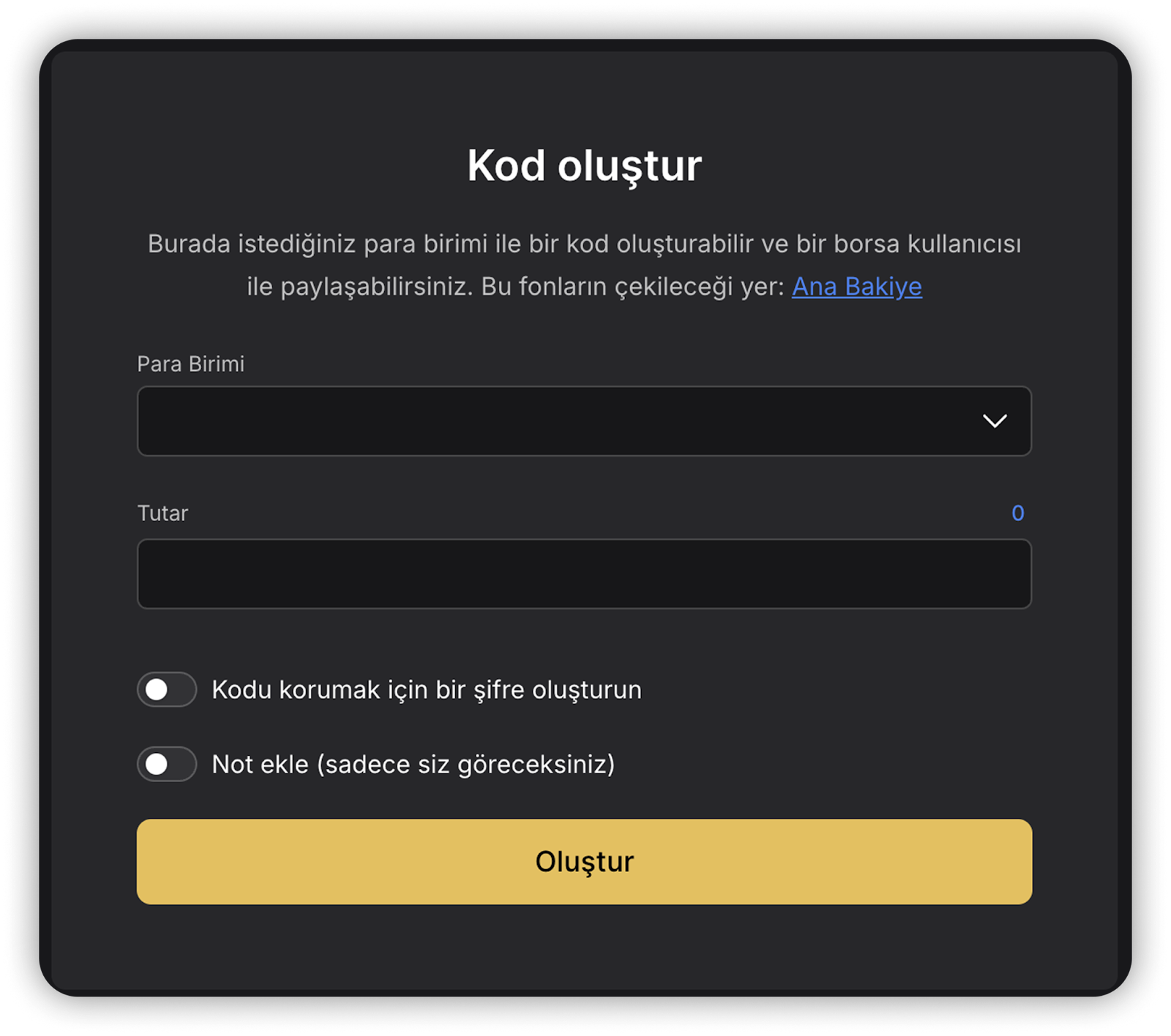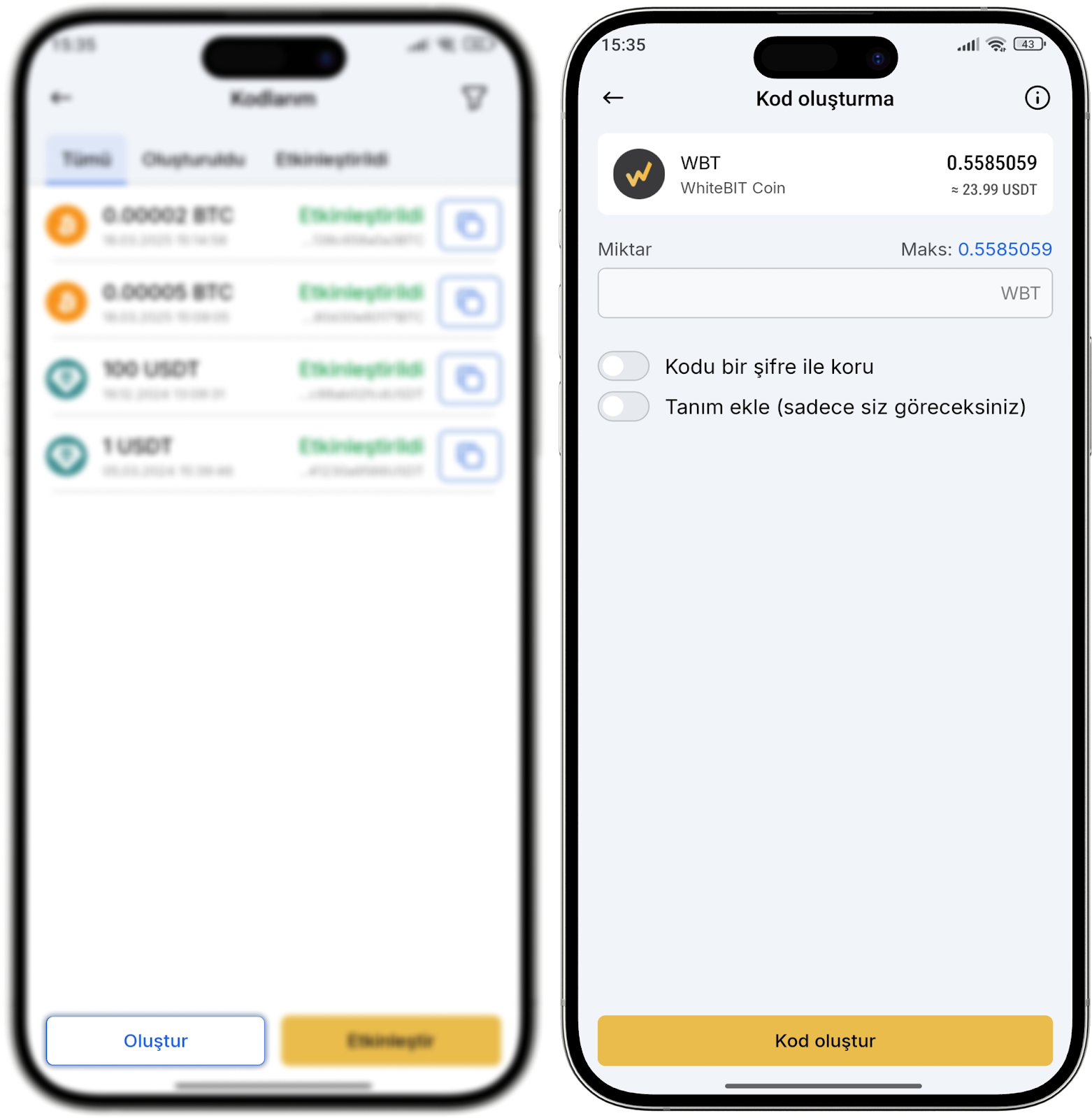 4. WhiteBIT Kodunuz için bir şifre belirleyebilirsiniz ve sadece sizin göreceğiniz şekilde bir tanım ekleyebilirsiniz. Bir şey eklemek istemiyorsanız “Kod oluştur”a tıklayabilirsiniz;