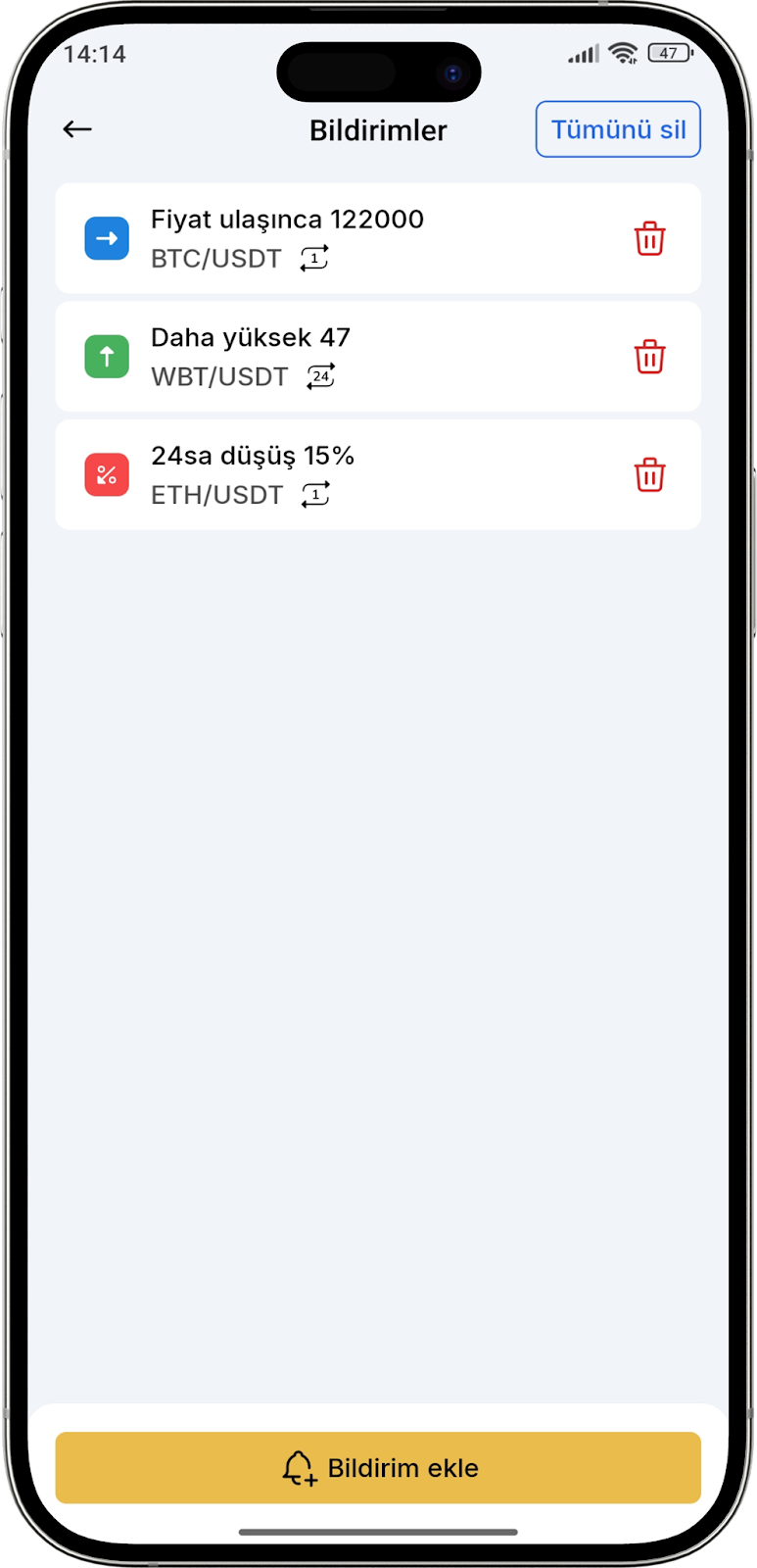 Fiyat uyarıları, piyasadaki dijital varlık fiyatlarındaki değişiklikleri takip etmenize yardımcı olur. Fiyat belirli bir değere ulaştığında bildirimlerin yanı sıra bu bildirimlerin sıklığını da ayarlayabilirsiniz.