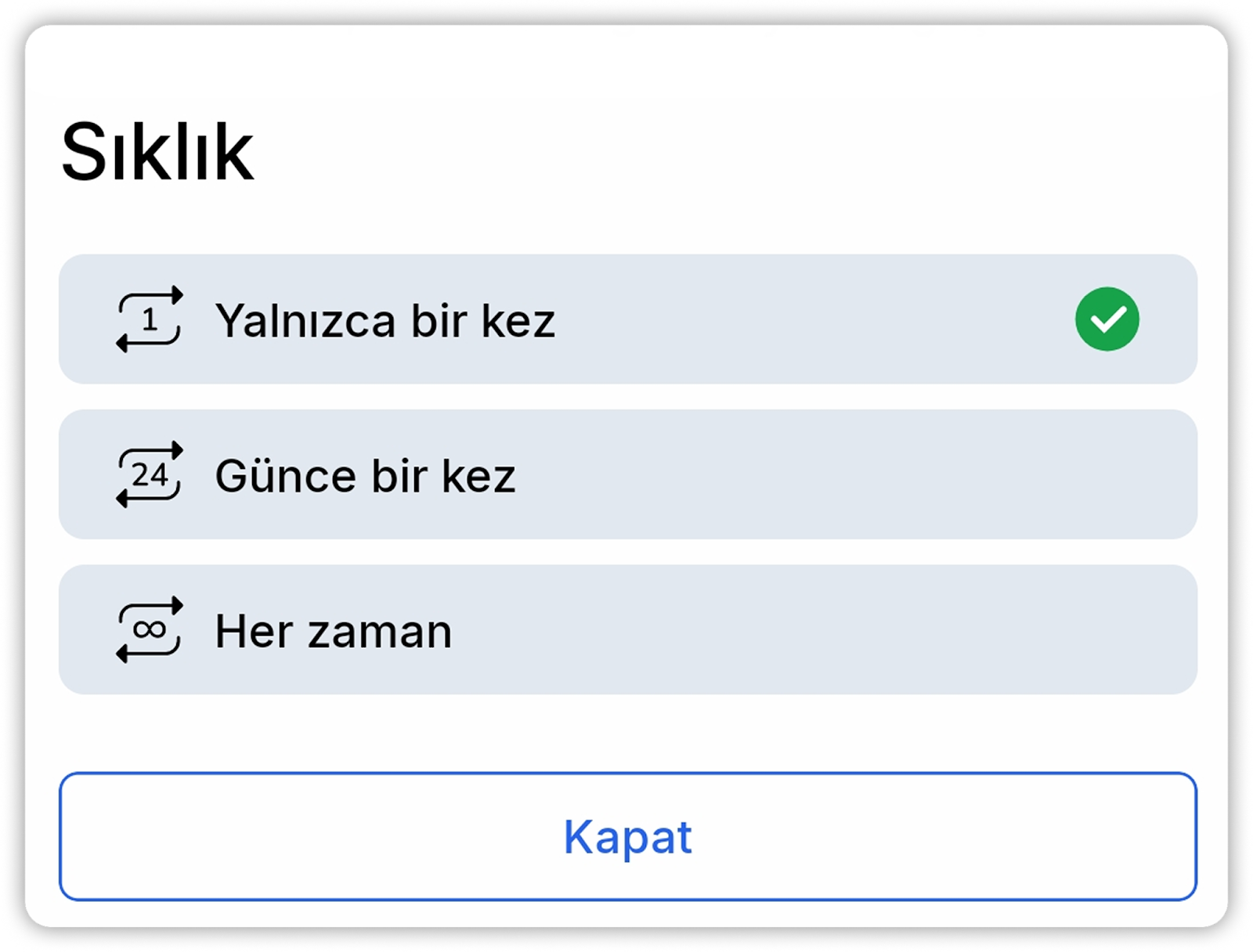 - “Sadece bir kez” - tek seferlik bir bildirim; tetiklendikten sonra bildirim listesinden kaldırılır.