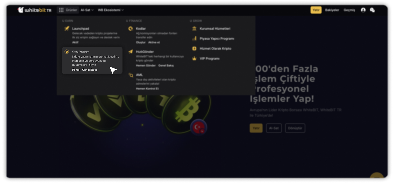 - WhiteBIT TR hesabınıza giriş yapın ve 'Otomatik Yatırım' bölümüne gidin. 'Ürünler' sekmesinin altında bulunabilir.