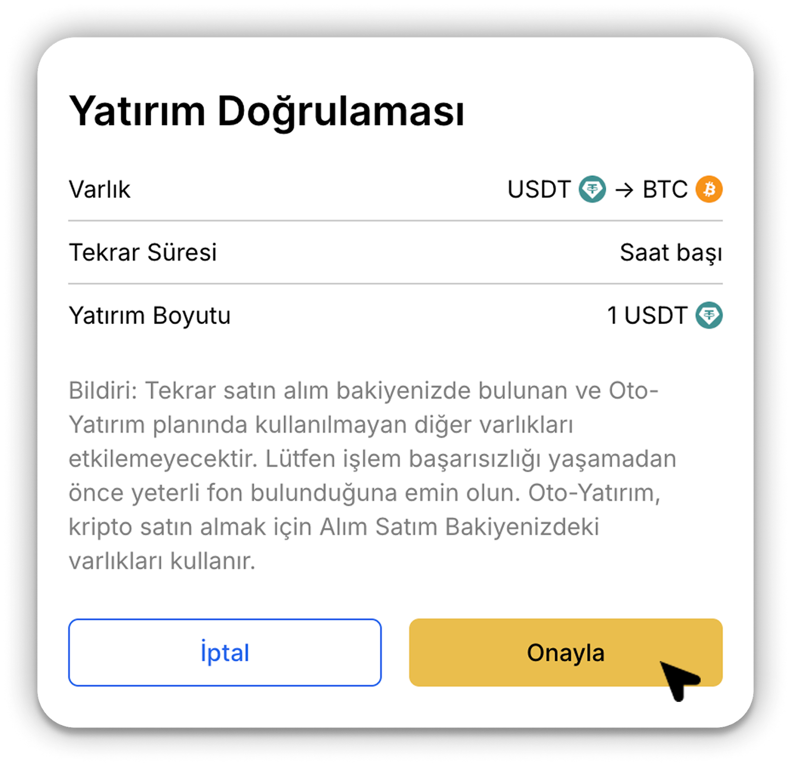 Bir Otomatik Yatırım planı kurulduktan sonra, arka planda sorunsuz bir şekilde çalışır ve yatırım stratejinizi tanımladığınız parametrelere göre yürütür. Fonlar Alım Satım Bakiyenizden düşülür ve belirlenen bir programa göre otomatik olarak yatırılır. Yeni satın aldığınız kripto para birimleri WhiteBIT TR'deki Alım Satım Bakiyenize yatırılacaktır.