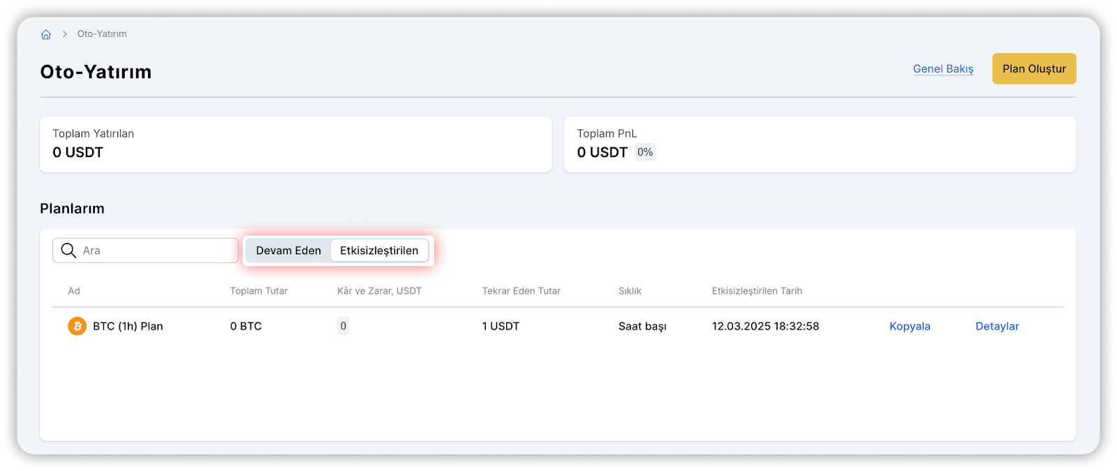 Net Plan Durumu: Otomatik Yatırım, planlarınızın durumunu anlamanızı kolaylaştırır. Aktif planlar devam eden satın alımları gösterirken, duraklatılmış veya devre dışı bırakılmış planlar ayrı ayrı kategorize edilerek birden fazla stratejiyi yönetmeyi kolaylaştırır.