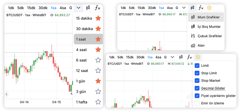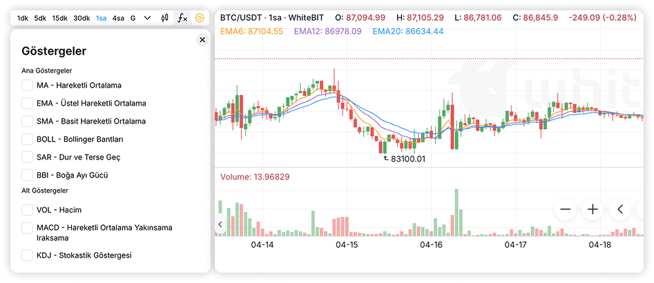 Grafiğin sağ üst tarafına geçtiğinizde, size grafik türünü seçme seçeneği sunulacaktır. Mevcut seçenekler arasında WhiteBIT TR temel grafiği ve TradingView grafiği bulunur. Bir TradingView grafiği seçerken, bu platform tarafından sunulan göstergeler ve grafik araçları gibi ek analiz araçlarına erişebileceksiniz. Uygun grafik görüntüleme moduna geçerek piyasa derinliğini (emir defteri) analiz etmek de mümkündür. Bu, piyasa durumunu değerlendirmenize ve bilinçli alım satım kararları almanıza yardımcı olacaktır.