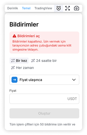 Buna ek olarak, daha kolay analiz için grafiği tam ekrana genişletebilirsiniz, kamera simgesine tıklayarak ekran görüntüsü alabilirsiniz veya alarm simgesini seçerek bir varlıktaki belirli fiyat veya yüzde değişikliği için bildirimler ayarlayabilirsiniz.