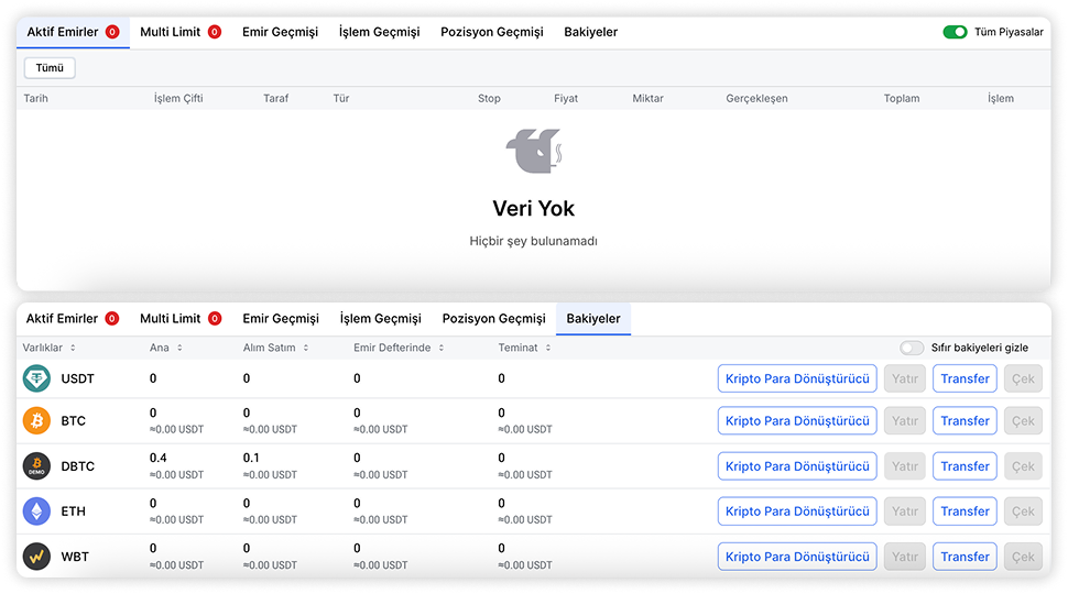Sayfanın altında, emirleri ve pozisyonları yönetmek için bir bölüm bulunmaktadır. Burada, seçilen alım satım çiftindeki son işlemlerin geçmişini görüntüleyebilirsiniz, bu da son piyasa faaliyetlerini analiz etmeye yardımcı olur. İlgili sekmelerde şunları yapabilirsiniz: