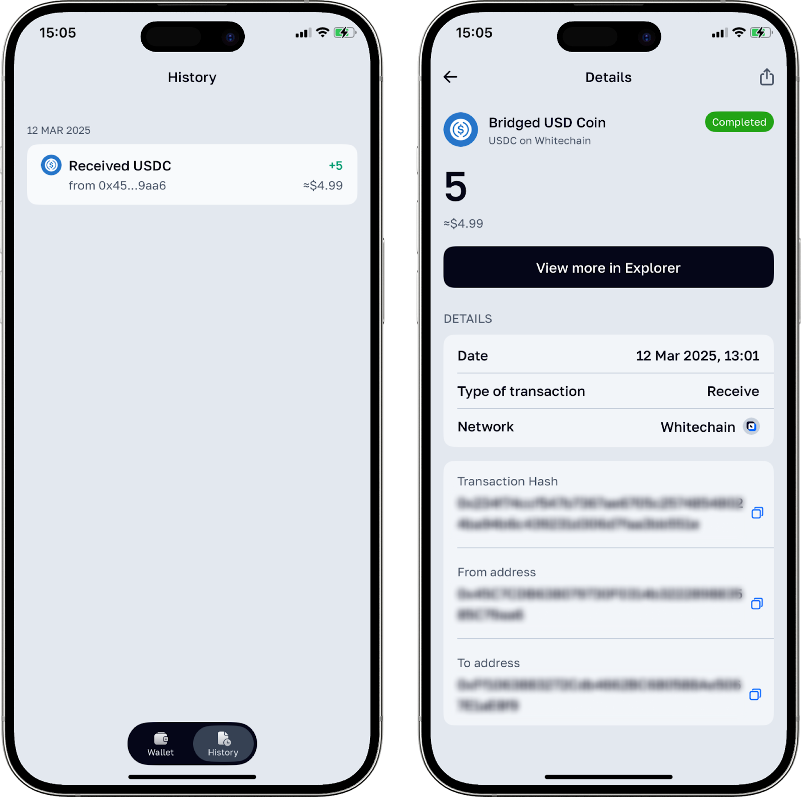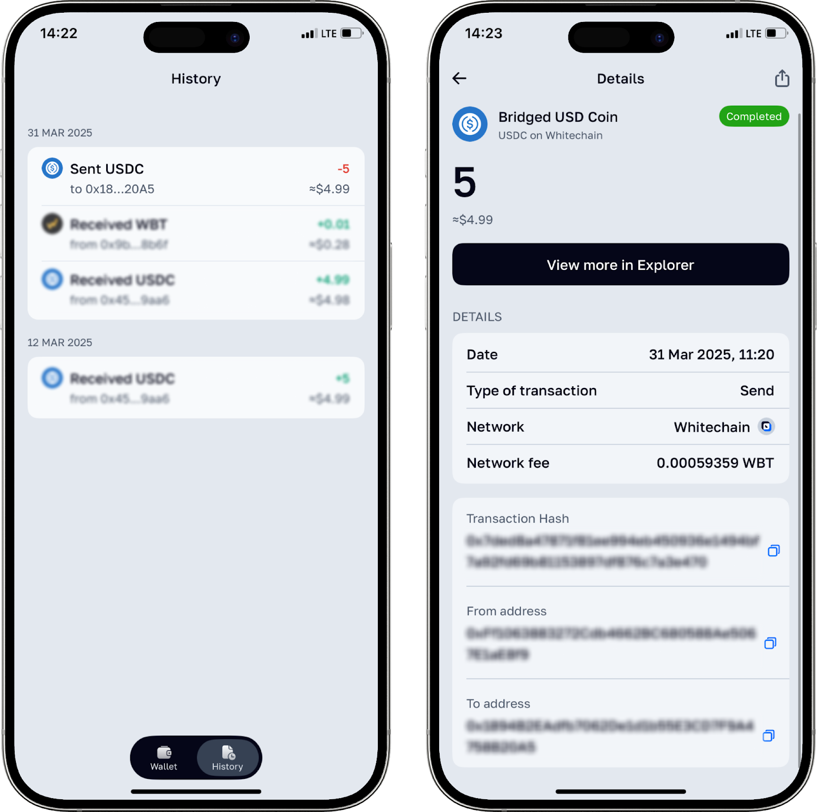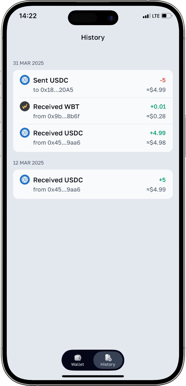 Önemli: İşlemlerin durumunu uygulamanın ana ekranındaki “History” bölümünden takip edebilirsiniz. Uygulama ayrıca Whitechain ağında WBT ve USDC, Ethereum ağında ETH, TRON ağında USDT ve TRX ve TON kendi ağında para çekme işlemleri de sunmaktadır.